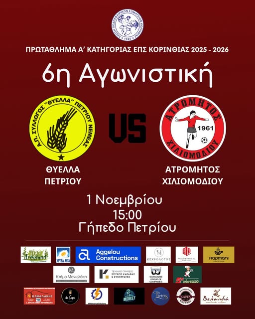 ΑΘΛΗΤΙΚΑ ΑΘΛΗΤΙΚΑ Θύλλα ΠΕΤΡΙΟΥ vs Ατρόμητος Χολιομοδίου 6η αγωνιστική 29/10/2025 @ 18:27 Copied to clipboard Διαβάστε επίσης 25/10/2025 @ 17:07 30 Οκτωβρίου – 2 Νοεμβρίου 2025: Η καρδιά του πανευρωπαϊκού αστυνομικού αθλητισμού χτυπά στην Κορινθία! 24/10/2025 @ 16:18 Α.Ε. Σολομού - Αετός Κρυονερίου 22/10/2025 @ 18:32 Ελλάς Βέλου – Άγιοι Θεόδωροι 2-1 20/10/2025 @ 17:16 Θριαμβευτική νίκη του Νικόλαου Οικονόμου – Στους «8» του Ευρωπαϊκού U15 18/10/2025 @ 18:06 Συνελήφθη πρόεδρος ομάδας της Super League Ροή ειδήσεων 29/10/2025 @ 19:55 Δείτε ζωντανά το δημοτικό συμβούλιο του δήμου Ξυλοκαστρου-Ευρωστίνης 29/10/2025 @ 19:00 Πότε αναμένονται οι πρώτες έρευνες για υδρογονάνθρακες σε Πελοπόννησο και Κρήτη 29/10/2025 @ 18:30 Με λαμπρότητα πραγματοποιήθηκε η μαθητική παρέλαση της 28ης Οκτωβρίου στο Δερβένι του Δήμου Ξυλοκάστρου - Ευρωστίνης 29/10/2025 @ 18:27 Θύλλα ΠΕΤΡΙΟΥ vs Ατρόμητος Χολιομοδίου 29/10/2025 @ 17:59 ΚΙ.Δ.Ε.ΣΙ.Π.: Ανοιχτή Επιστολή στο ΠΕ.ΣΥ. Πελοποννήσου 29/10/2025 @ 17:19 Πέλοψ - Μπουμπουλίνα Σπετσών 6-0 29/10/2025 @ 17:07 Χρονοδιάγραμμα πληρωμών για τους αγρότες 29/10/2025 @ 16:58 Ώρες δημιουργίας για τους μαθητές του Ειδικού Δημοτικού Σχολείου Κορίνθου (ΦΩΤΟ) 29/10/2025 @ 16:43 Επανέναρξη εργασιών στο Φράγμα Ασωπού με τη συμμετοχή του Δήμου Βέλου-Βόχας (ΦΩΤΟ) 29/10/2025 @ 13:30 Συνέντευξη με τον Παναγιώτη Λάλεζα, το αηδόνι του Μοριά (ΒΙΝΤΕΟ) 29/10/2025 @ 12:03 Μέρα χαράς για Κορινθία-Επανεκκίνηση των εργασιών στο φράγμα του Ασωπού 29/10/2025 @ 11:43 Ο ΔΗΜΟΣ ΚΟΡΙΝΘΙΩΝ ΤΙΜΑ ΤΟΥΣ 29 ΑΡΧΑΙΟΚΟΡΙΝΘΙΟΥΣ ΤΗΣ ΚΑΤΟΧΗΣ 29/10/2025 @ 11:21 Το αποχετευτικό στον παραλιακό Σαρωνικό προχωρά!(BINTEO) 29/10/2025 @ 10:43 Λειψυδρία: Στερεύει ο Μόρνος – Μειωμένη κατά 44% η έκταση της λίμνης – Έρχονται έκτακτα μέτρα 29/10/2025 @ 09:17 Οι παρελάσεις, ο Κ.Μ, ο Δένδιας και η εταιρεία καθαρισμού, ο Προκόπιος με τις διαρροές, όπου να ’ναι… σπάνε τα νερά, η ρύθμιση για το ελβετικό 29/10/2025 @ 09:00 Παρέλασε δυναμικά το 1ο Γυμνάσιο Κορίνθου! (ΦΩΤΟ) 29/10/2025 @ 08:00 Με λαμπρότητα τιμήθηκε η Εθνική Επέτειος της 28ης Οκτωβρίου 1940 από τα σχολεία Κοκκωνίου - Πουλίτσας! (ΦΩΤΟ) 28/10/2025 @ 11:51 Σύνταγμα: Γέμισε αστυνομικούς το Μνημείο του Αγνώστου Στρατιώτη 28/10/2025 @ 11:48 Σε συναγερμό η ΕΛ.ΑΣ. για το ισραηλινό πλοίο «Crown Iris» που φθάνει αύριο (29/10) στην Πάτρα 28/10/2025 @ 11:15 Δείτε ζωντανά την μεγάλη στρατιωτική παρέλαση της Θεσσαλονίκης για την επέτειο της 28ης Οκτωβρίου 1940 Δείτε επίσης 29/10/2025 @ 12:03 Μέρα χαράς για Κορινθία-Επανεκκίνηση των εργασιών στο φράγμα του Ασωπού 29/10/2025 @ 11:43 Ο ΔΗΜΟΣ ΚΟΡΙΝΘΙΩΝ ΤΙΜΑ ΤΟΥΣ 29 ΑΡΧΑΙΟΚΟΡΙΝΘΙΟΥΣ ΤΗΣ ΚΑΤΟΧΗΣ 29/10/2025 @ 11:21 Το αποχετευτικό στον παραλιακό Σαρωνικό προχωρά!(BINTEO) 29/10/2025 @ 10:43 Λειψυδρία: Στερεύει ο Μόρνος – Μειωμένη κατά 44% η έκταση της λίμνης – Έρχονται έκτακτα μέτρα 29/10/2025 @ 09:17 Οι παρελάσεις, ο Κ.Μ, ο Δένδιας και η εταιρεία καθαρισμού, ο Προκόπιος με τις διαρροές, όπου να ’ναι… σπάνε τα νερά, η ρύθμιση για το ελβετικό 27/10/2025 @ 15:34 Στο φράγμα του Ασωπού ο Χρίστος Δήμας 27/10/2025 @ 14:56 Συνάντηση του Γρηγόρη Δημητριάδη με την Όλγα Μαγγανά, μέλος της Πολιτικής Επιτροπής της ΝΔ 27/10/2025 @ 12:05 Μήνυμα του Υπουργείου Μεταφορών στους οδηγούς: «Αν αγαπάς την οικογένειά σου, προσοχή στον δρόμο»