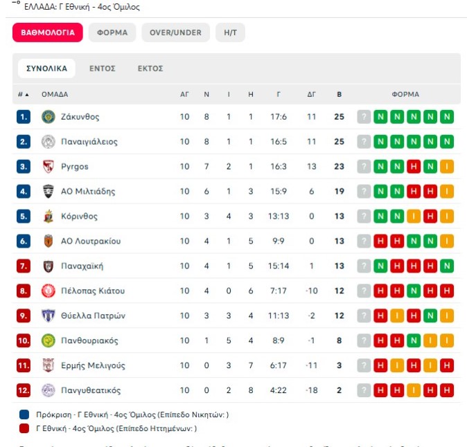 Η Βαθμολογία του 4ου Ομίλου της Γ'εθνικής: