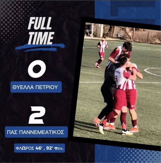 Το τελικό 0-2 διαμορφώθηκε στις καθυστερήσεις με εκτέλεση πέναλτι του Φλώρου, μετά από παράβαση που κέρδισε ο ίδιος από τον Κώστα Μπακασέτα, με τον τερματοφύλακα του Πετρίου να αποβάλλεται για το χτύπημα προς τον παίκτη μας.