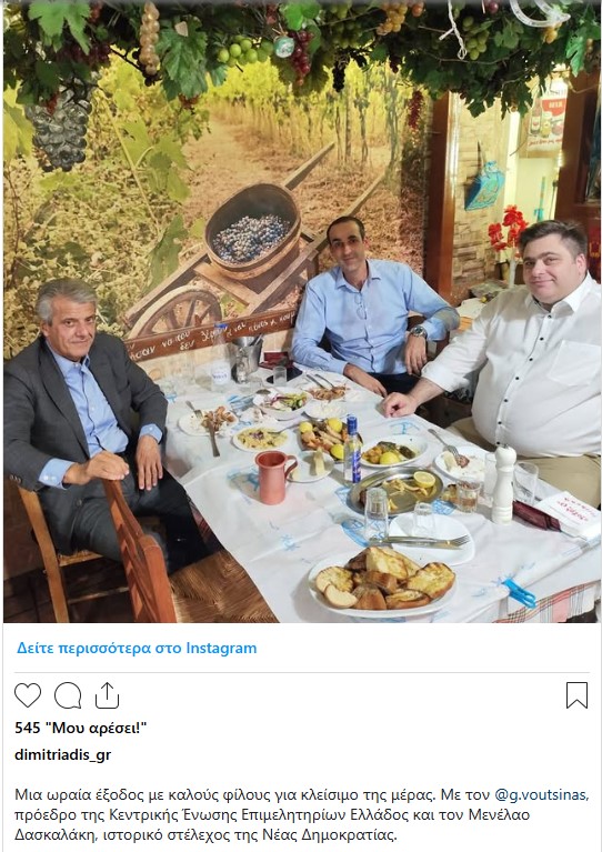 «Μια ωραία έξοδος με καλούς φίλους για κλείσιμο της μέρας. Με τον Γιάννη Βουτσινά, πρόεδρο της Κεντρικής Ένωσης Επιμελητηρίων Ελλάδος και τον Μενέλαο Δασκαλάκη, ιστορικό στέλεχος της Νέας Δημοκρατίας», σχολίασε ο Γρηγόρης Δημητριάδης σε ανάρτησή του στο Instagram.