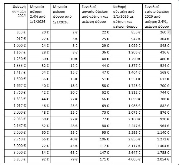 Σύμφωνα με τον σχετικό πίνακα που επεξεργάστηκε και δημοσιεύει το Capital.gr λόγω της αύξησης κατά 2,4%, και της μείωσης της παρακράτησης φόρου στις συντάξεις για το 2026: