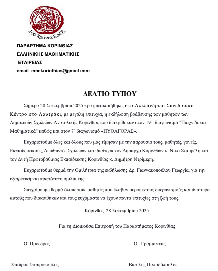 ΚΟΡΙΝΘΙΑΚΑ ΔΗΜΟΣ ΛΟΥΤΡΑΚΙΟΥ ΜΑΘΗΤΕΣ ΔΗΜΟΤΙΚΟ ΣΧΟΛΕΙΟ ΒΡΑΒΕΥΣΗ ΔΙΑΓΩΝΙΣΜΟΣ ΜΑΘΗΜΑΤΙΚΩΝ Βράβευση μαθητών που διακρίθηκαν στο διαγωνισμό μαθηματικών 29/09/2025 @ 09:12 Copied to clipboard Διαβάστε επίσης 29/09/2025 @ 15:54 Αρχιερατική Θ. Λειτουργία στον Ι. Ναό Αγίων Κωνσταντίνου και Ελένης στα Λουτρά της Ωραίας Ελένης Κορινθίας & Πανηγυρικός Εσπερινός στον Ι. Ναό Απ. Παύλου Κορίνθου για τη μνήμη του Οσίου Κυριακού του Αναχωρητού 27/09/2025 @ 13:10 ΑΟΛ: 1ο παιχνίδι στην έδρα μας στο πρωτάθλημα Γ Εθνικής! 26/09/2025 @ 14:24 Κλείνει για 12 ώρες η γέφυρα της Ποσειδωνίας την Τρίτη 30 Σεπτεμβρίου 25/09/2025 @ 17:11 Λουτράκι: Πρόσκληση στις εκδηλώσεις για τη Μάχη της Περαχώρας 22/09/2025 @ 16:59 Κόρινθος: Ξεκινούν τα τμήματα Κιθάρας για παιδιά στο 10ο Δημοτικό Σχολείο Ροή ειδήσεων 30/09/2025 @ 17:24 Κόρινθος: Ξεκινούν εβδομαδιαίες ομάδες των Κ.Α.Π.Η. 30/09/2025 @ 17:16 Ανακήρυξη Νικητών του Μεγάλου Εκπαιδευτικού Διαγωνισμού Ανακύκλωσης Σχολείων των Δήμων Περιφέρειας Πελοποννήσου 30/09/2025 @ 17:09 Παρέμβαση Ψυχογιού και αναγνώριση από ΥΠΑΑΤ για τη ζημιά και στήριξη των λεμονοπαραγωγών 30/09/2025 @ 17:01 Επιστολή της ΓΣΕΕ στην Υπουργό Εργασίας Ν.Κεραμέως για το Εργασιακό Νομοσχέδιο 30/09/2025 @ 16:43 𝝤 𝝙ή𝝻𝝾ς 𝝟𝝾𝞀𝝸𝝼𝝷ί𝞈𝝼 𝞂𝞃𝝾 𝝥𝝰𝞀ί𝞂𝝸 – 𝗜𝗙𝗧𝗠 𝗧𝗼𝗽 𝗥𝗲𝘀𝗮 (ΦΩΤΟ) 30/09/2025 @ 16:30 Ξεκινούν οι εγγραφές για το 2ο έτος του Δημοτικού Ελεύθερου Ανοικτού Πανεπιστημίου Κορινθίων! 30/09/2025 @ 16:20 ΣΥΠΑ: Ποιοι και γιατί στήνουν το Πρόγραμμα «Πόρτα – Πόρτα»; 30/09/2025 @ 16:00 Ενημέρωση για την εξέλιξη του προγράμματος δακοκτονίας έτους 2025 30/09/2025 @ 15:56 Δήμος Σικυωνίων: Ενδυνάμωση μέσω Γνώσης: Μια Δράση για την Εκπαίδευση των Ρομά 30/09/2025 @ 13:43 Ερώτηση Γιάννη Μανιάτη στην Κομισιόν για το φαινόμενο της ξήρανσης δασών ελάτης στην Ελλάδα 30/09/2025 @ 13:42 Συναγερμός για το νερό της Αθήνας: Φτάνει μόνο για έναν χρόνο αν οι βροχές είναι ελάχιστες και φέτος 30/09/2025 @ 13:09 Β.ΝΑΝΟΠΟΥΛΟΣ για νερό: O Πνευματικός είπε μόνο την αρχή της ιστορίας. Ο Σταματόπουλος δεν είναι φίλος των Κορινθίων(BINTEO) 30/09/2025 @ 12:58 ΕΞΕΛΙΞΗ: Υπογράφηκε το Μνημόνιο για τις 2+2 ιταλικές φρεγάτες Bergamini 30/09/2025 @ 12:38 Γελάει ο κόσμος με το πέναλτι που έδωσαν στον αγώνα του ΠΑΣ Κόρινθος(ΒΙΝΤΕΟ) 30/09/2025 @ 10:22 Τάσος Μποζίκης: Θέλω να παραμείνω στην ΑΝΒΟΠΕ. Ναι από Σταυρέλη! (ΒΙΝΤΕΟ) 30/09/2025 @ 09:41 Bολές Νανόπουλου για το νερό. Ο Σταματόπουλος παρανομεί (ΒΙΝΤΕΟ) 30/09/2025 @ 09:34 ΚΙΑΤΟ: Καμία απάντηση από την δημοτική αρχή για τον ΔΗΜΟΦΙΛΟ 30/09/2025 @ 08:53 NAI σε όλες τις αποφάσεις από τη Γεωργία Στριμενοπούλου 30/09/2025 @ 08:42 Nίκος Σταυρέλης: H Kόρινθος έχει νερό Στυμφαλίας (ΒΙΝΤΕΟ) 29/09/2025 @ 19:03 Ο «χάρτης» των πληρωμών από e-ΕΦΚΑ, ΔΥΠΑ για αυτή την εβδομάδα Δείτε επίσης 30/09/2025 @ 13:43 Ερώτηση Γιάννη Μανιάτη στην Κομισιόν για το φαινόμενο της ξήρανσης δασών ελάτης στην Ελλάδα 30/09/2025 @ 13:42 Συναγερμός για το νερό της Αθήνας: Φτάνει μόνο για έναν χρόνο αν οι βροχές είναι ελάχιστες και φέτος 30/09/2025 @ 12:58 ΕΞΕΛΙΞΗ: Υπογράφηκε το Μνημόνιο για τις 2+2 ιταλικές φρεγάτες Bergamini 29/09/2025 @ 09:44 Γιατί όλοι οι γαλάζιοι βουλευτές πηγαίνουν στο «στρατηγείο» του Γρηγόρη Δημητριάδη στο Κολωνάκι 29/09/2025 @ 09:15 Το Τουρκικό ναυάγιο που ξεκίνησε σαν θρίαμβος.Toυ Κώστα Στούπα 26/09/2025 @ 14:00 Στους Έλληνες πλοιοκτήτες τα σκήπτρα της παγκόσμιας ναυτιλίας 26/09/2025 @ 13:45 Άρειος Πάγος: Τα αιτήματα εκταφής των συγγενών θυμάτων των Τεμπών μελετώνται και πρόκειται σύντομα να απαντηθούν 26/09/2025 @ 13:09 Μιλάτε σε ανοιχτή ακρόαση δημοσίως; Πότε είναι αποδεκτό και πότε όχι