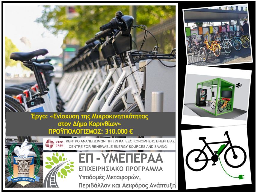 Μετά την διατύπωση θετικής γνώμης για το τεύχος της διακήρυξης και την διαγωνιστική διαδικασία από την αρμόδια διαχειριστική αρχή του Υπουργείου Ανάπτυξης & Επενδύσεων (Ειδική Γραμματεία Διαχείρισης Προγραμμάτων Ευρωπαϊκού Ταμείου Περιφερειακής Ανάπτυξης & Ταμείου Συνοχής), σήμερα Τρίτη 28/3/2023 η Οικονομική Επιτροπή του Δήμου Κορινθίων ενέκρινε αντίστοιχα την εν λόγω διαγωνιστική διαδικασία του έργου «Ενίσχυση της Μικροκινητικότητας στο Δήμο Κορινθίων», προϋπολογισμού: 309.837,56 € και χρηματοδότησης από το Πρόγραμμα “Βιώσιμη μικροκινητικότητα μέσω συστήματος κοινόχρηστων ποδηλάτων σε Δήμους της Χώρας (εκτός Δήμων Μητροπολιτικών Κέντρων)”.