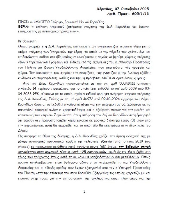 Ο βουλευτής Κορινθίας του ΣΥΡΙΖΑ-ΠΣ, Γιώργος Ψυχογιός καταθέτει ως Αναφορά την από Επτά (07) Οκτωβρίου 2025 επιστολή της ΕΝΩΣΗΣ ΑΣΤΥΝΟΜΙΚΩΝ ΥΠΑΛΛΗΛΩΝ ΚΟΡΙΝΘΙΑΣ, σύμφωνα με την οποία ζητούν την άμεση επίλυση του σοβαρού κτηριακού ζητήματος στέγασης της Διεύθυνσης Αστυνομίας Κορινθίας, καθώς και την ενίσχυση της δύναμης με μόνιμο αστυνομικό προσωπικό, καθώς οι τεράστιες ελλείψεις καθιστούν αδύνατη ακόμη και τη στελέχωση των νέων Υπηρεσιών που έχουν εξαγγελθεί.
