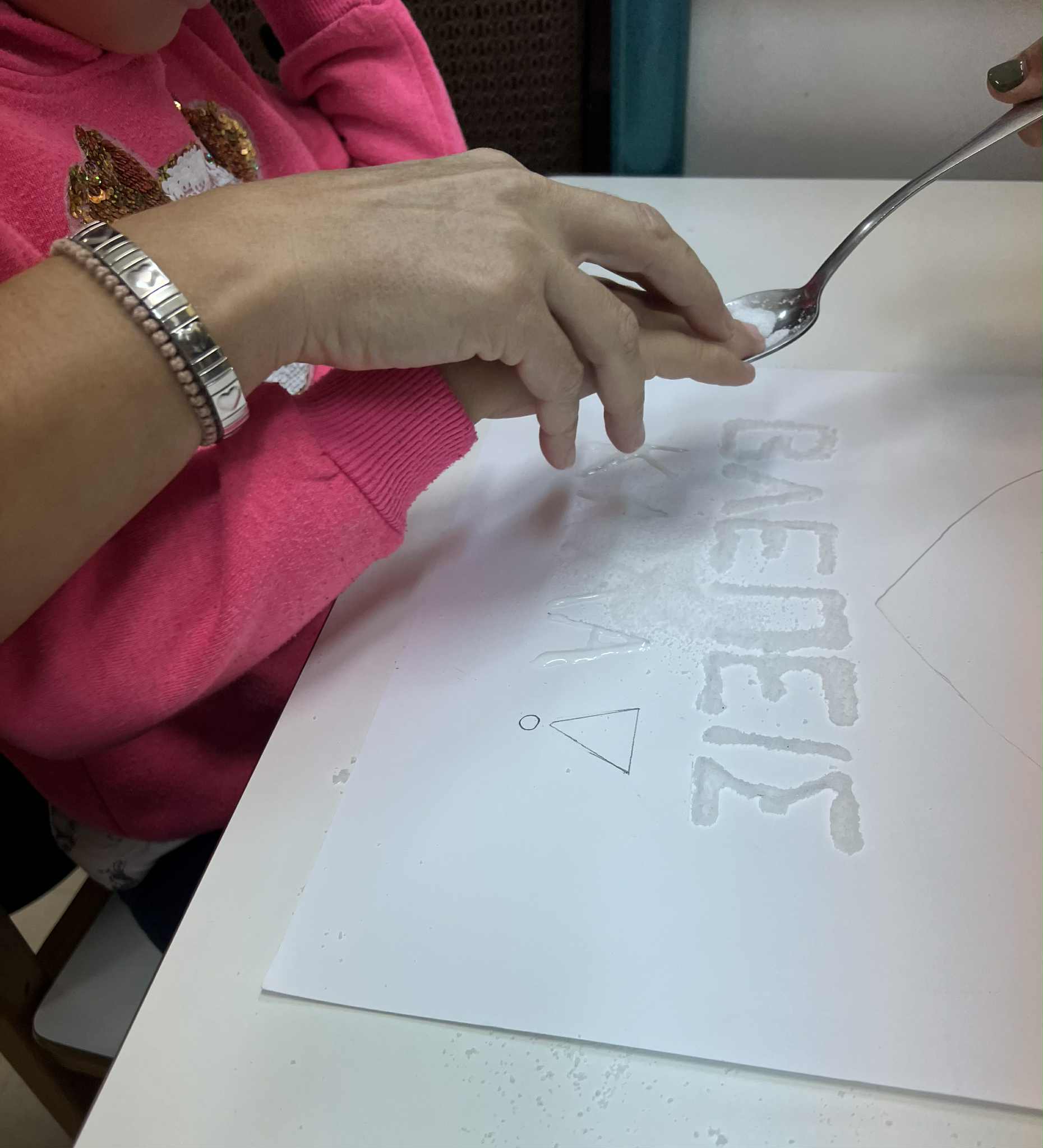 Συγκεκριμένα, κινηθήκαμε στην αίθουσά μας με τη χρήση Λευκού Μπαστουνιού και κλειστά τα μάτια με μαντήλι. Δημιουργήσαμε, επίσης, με αλάτι, μια αφίσα με ένα σχετικό μήνυμα. Η αφίσα μας έγινε ανάγλυφη, για να μοιάζει με τη γραφή Μπράιγ.