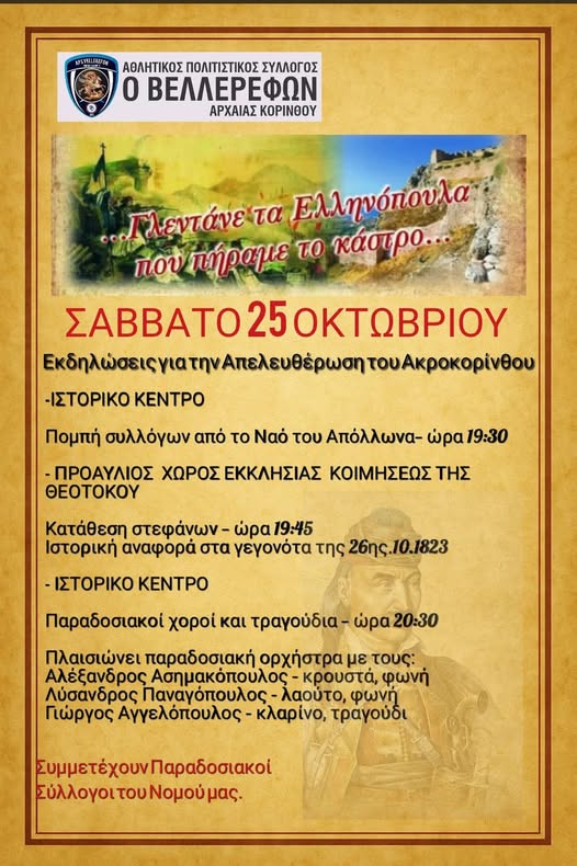 Η εκδήλωση διοργανώνεται από τον Αθλητικό – Πολιτιστικό Σύλλογο “Βελλερεφών” Αρχαίας Κορίνθου.