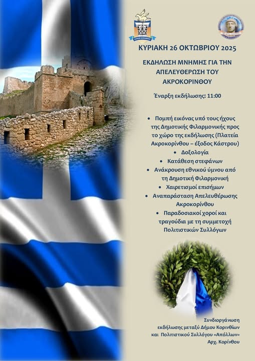 Ο Δήμος Κορινθίων και η Διεύθυνση Πολιτισμου σε συνεργασια με τον Πολιτιστικο Συλλογο Απολλων Αρχαιας Κορινθου διοργανωνουν την Κυριακη 26 Οκτωβριου 2025 στις 11:00 π.μ. εκδηλωση μνημης για την Απελευθερωση του Ακροκορινθου.
