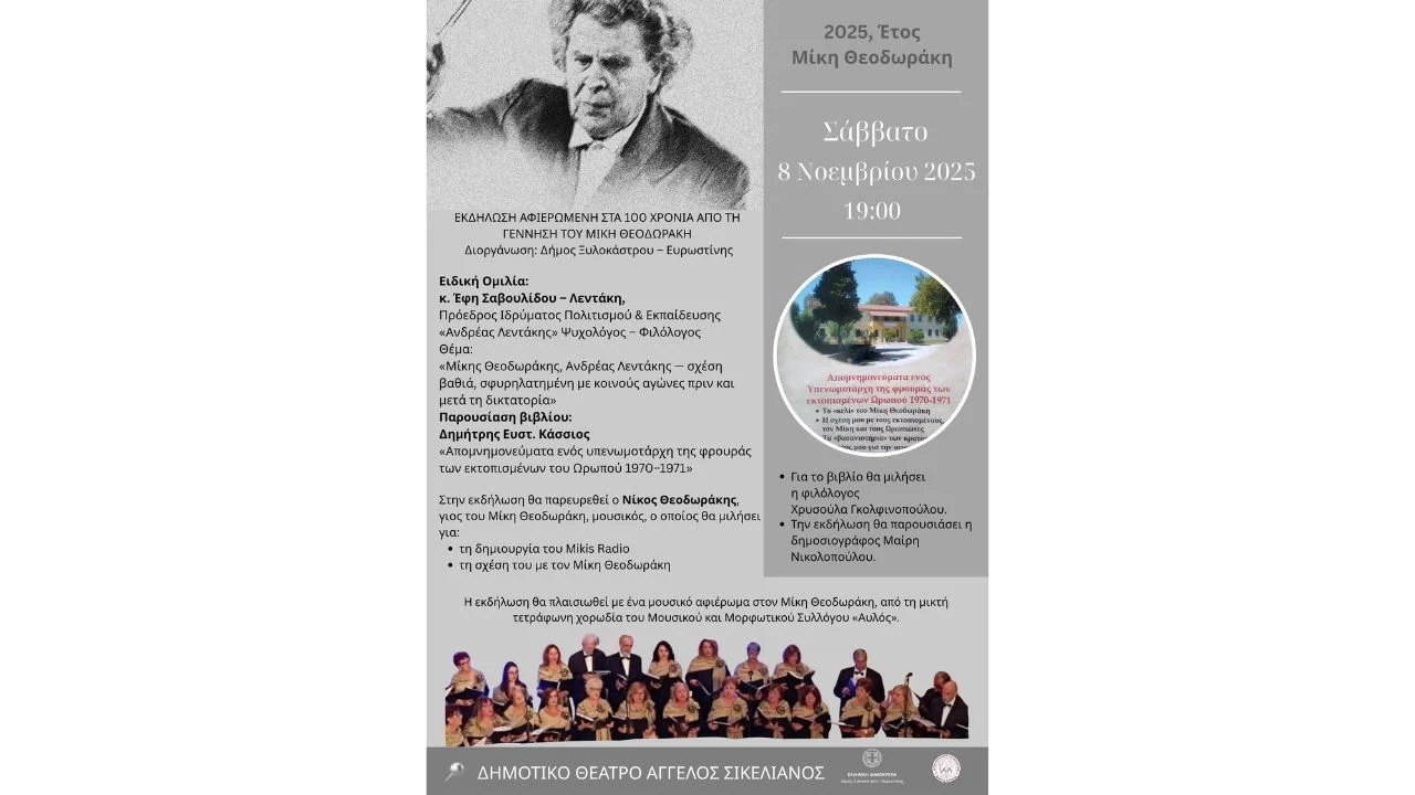 Ο Δήμος Ξυλοκάστρου – Ευρωστίνης, σε συνεργασία με τον συγγραφέα Δημήτρη Ευστ. Κάσσιο, τιμά τον Μίκη Θεοδωράκη με αφορμή τη συμπλήρωση 100 χρόνων από τη γέννησή του, διοργανώνοντας μια ξεχωριστή εκδήλωση στο Δημοτικό Θέατρο “Άγγελος Σικελιανός” το Σάββατο 8 Νοεμβρίου 2025, ώρα 19:00.