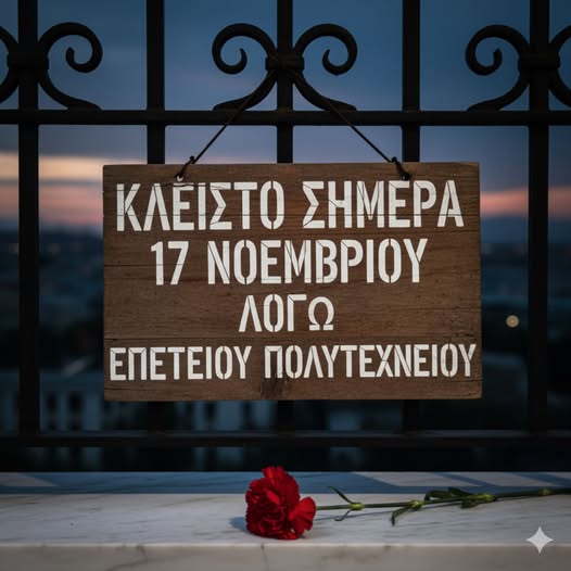 Τιμώντας την Επέτειο του Πολυτεχνείου, τη 𝝙𝝴𝞄𝞃έ𝞀𝝰 𝟭𝟳 𝝢𝝾𝝴𝝻𝝱𝞀ί𝝾𝞄 𝟮𝟬𝟮𝟱 δεν θα πραγματοποιηθούν μαθήματα.