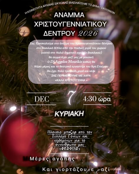 «Φωταγώγηση δέντρου» Στολισμός Χριστουγεννιάτικου δέντρου και δώρα από τον Άγιο Βασίλη με τη συμμετοχή του θεατρικού εργαστηρίου του πολιτιστικού συλλόγου «Ορθαγόρας» και μουσική από το Dj Άγγελο Μουρίκη.