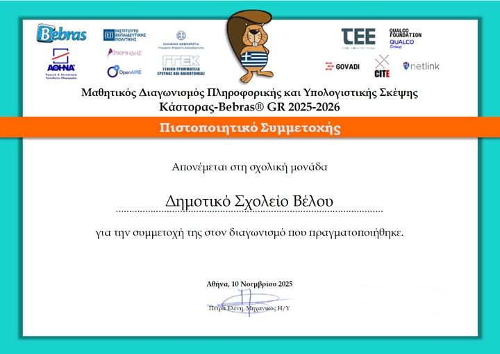 «Με μεγάλη χαρά, σας ενημερώνουμε για την επιτυχή ολοκλήρωση του φετινού διαγωνισμού Bebras (Κάστορας), όπου οι μαθητές του Δημοτικού σχολείου Βέλου απέδειξαν με τον καλύτερο τρόπο τις δεξιότητές τους στην Υπολογιστική Σκέψη!