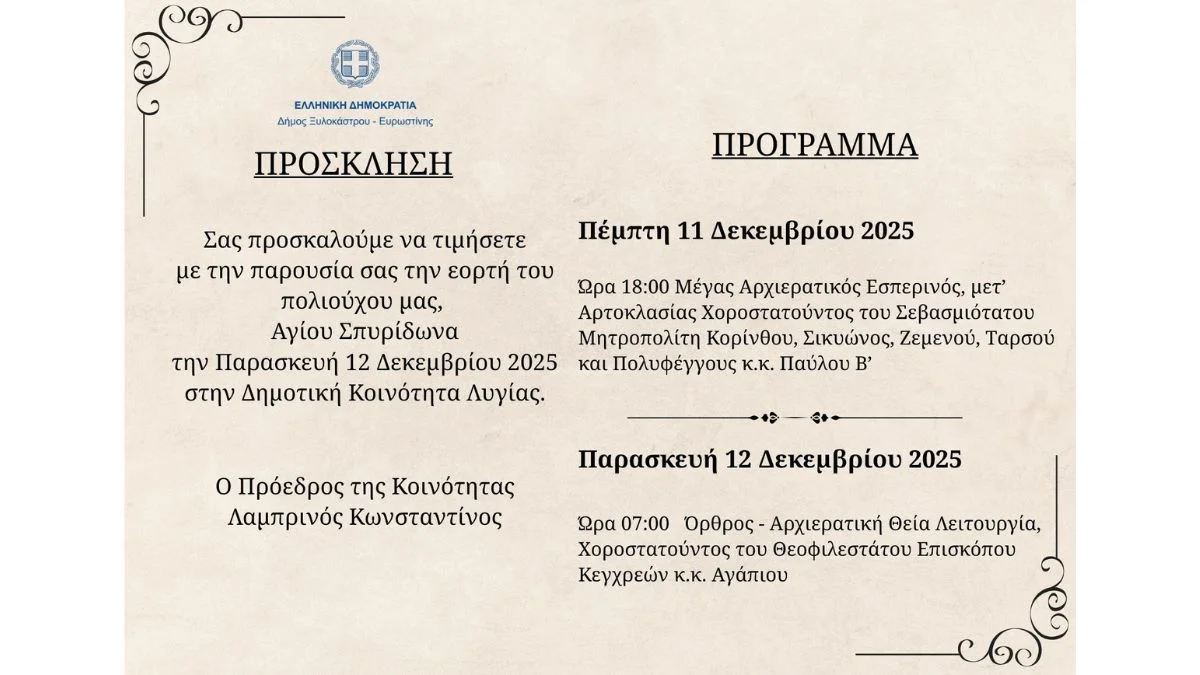 Η Δημοτική Κοινότητα Λυγιάς σας προσκαλεί να τιμήσετε με την παρουσία σας την εορτή του πολιούχου μας, Αγίου Σπυρίδωνος, την Παρασκευή 12 Δεκεμβρίου 2025.