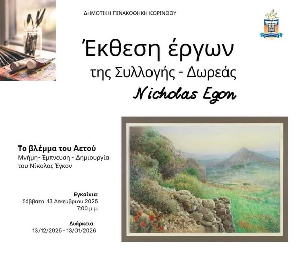 Η Δημοτική Πινακοθήκη Κορίνθου παρουσιάζει την έκθεση έργων της Συλλογής–Δωρεάς του Nicholas Egon, με τίτλο «Το βλέμμα του Αετού».
