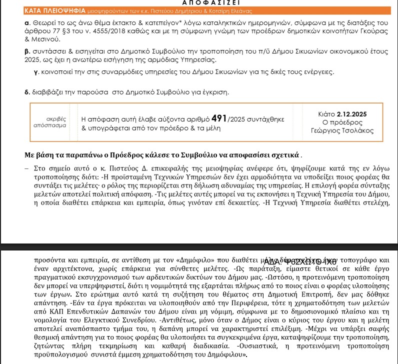 Κατά τη συνεδρίαση του Δημοτικού Συμβουλίου Σικυωνίων, με θέμα την τροποποίηση του προϋπολογισμού οικονομικού έτους 2025, η παράταξη «Επόμενη Μέρα» καταψήφισε ρητά και αιτιολογημένα την εισήγηση της δημοτικής αρχής.