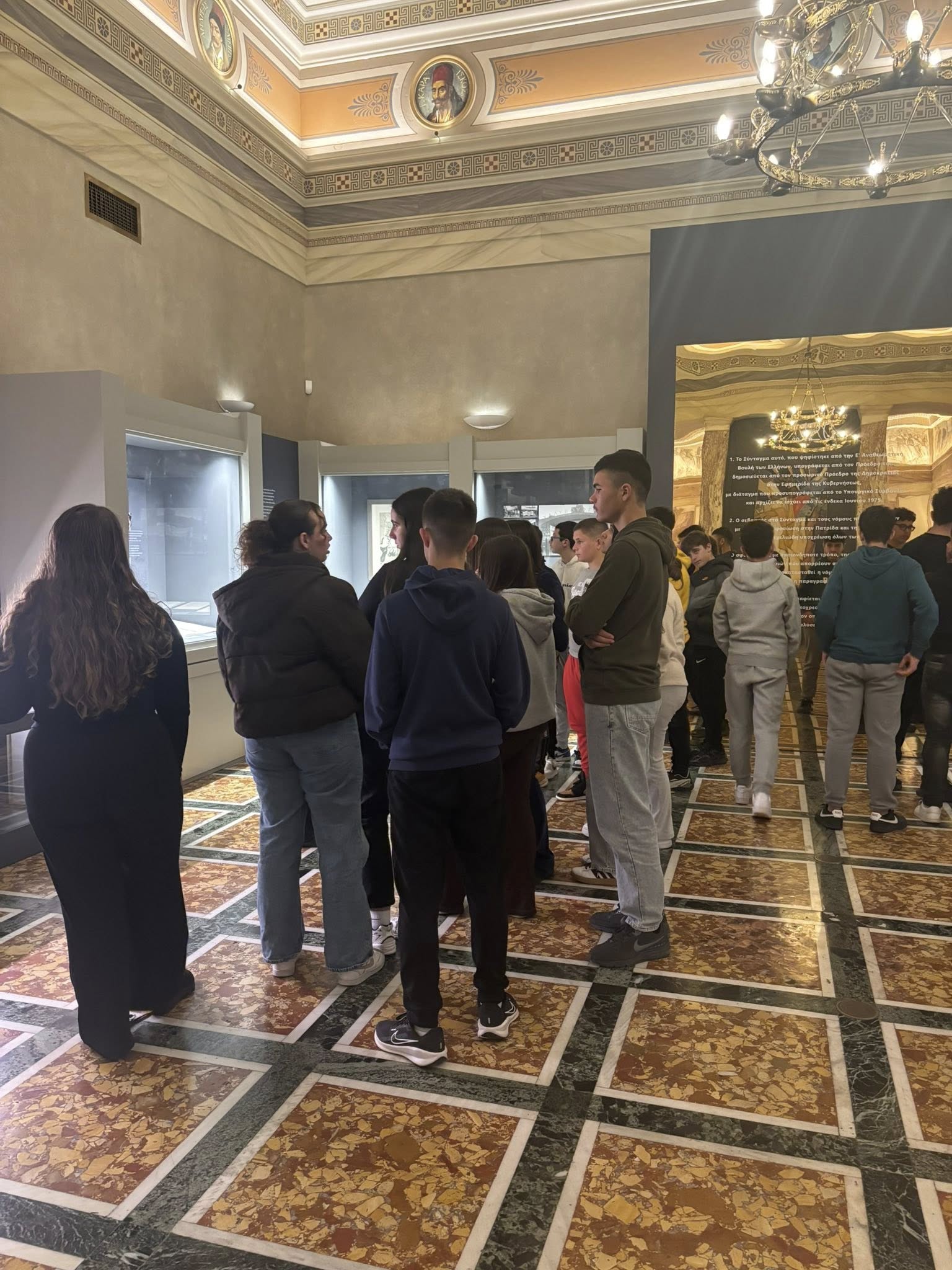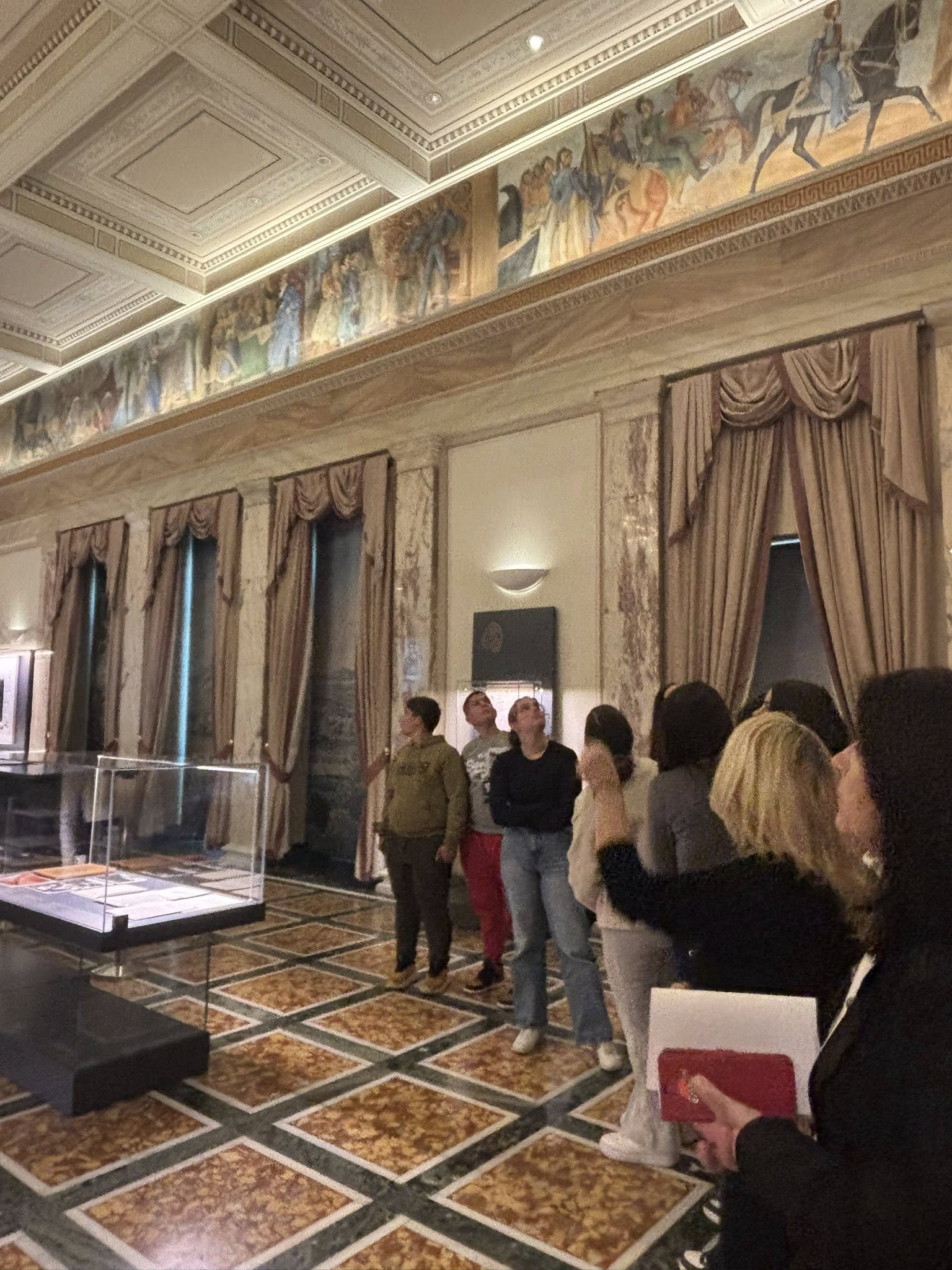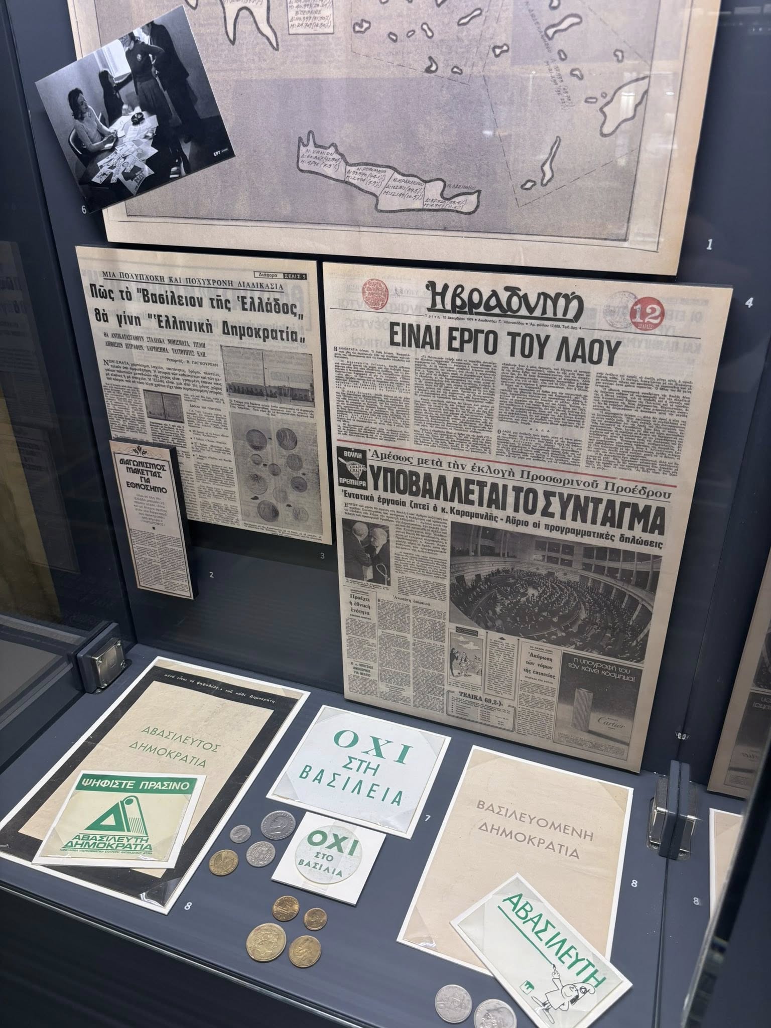 Η εξαιρετική ξεναγός μας μάς έδωσε όσες πληροφορίες χρειαζόμασταν για την ιστορία του κτιρίου και μας οδήγησε στην Έκθεση για το Σύνταγμα και τα Δικαιώματα