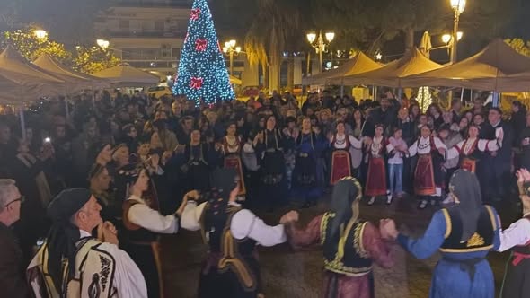 Σε ένα εορταστικό σκηνικό γεμάτο φως και χρώμα, οι πολιτιστικοί σύλλογοι πρόσφεραν παραδοσιακά κεράσματα στους παρευρισκόμενους, μοιράζοντας γεύσεις και αρώματα που θύμισαν οικογενειακή θαλπωρή και χριστουγεννιάτικη παράδοση.