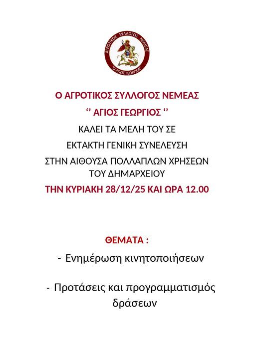ΚΟΡΙΝΘΙΑΚΑ ΚΟΡΙΝΘΙΑ ΔΗΜΟΣ ΝΕΜΕΑΣ ΑΓΡΟΤΙΚΟΣ ΣΥΛΛΟΓΟΣ Κάλεσμα του Αγροτικού Συλλόγου Νεμέας σε Έκτακτη Γενική Συνέλευση την Κυριακή 28 Δεκεμβρίου Ποια τα θέματα 25/12/2025 @ 13:05 Copied to clipboard Διαβάστε επίσης 10/02/2026 @ 17:22 Ο Δήμος Βέλου Βόχας και φέτος γιορτάζει το έθιμο της Τσικνοπέμπτης! 10/02/2026 @ 16:54 Με χαμόγελα και παιχνίδι γιόρτασαν οι μαθητές του 8ου Δημοτικού Σχολείου Κορίνθου την Αποκριά (ΦΩΤΟ) 10/02/2026 @ 14:21 Συμμαχία Νέων Σικυωνίων: «Ο στρατηγικός μετασχηματισμός του Κιάτου σε τροχιά υλοποίησης» 10/02/2026 @ 12:34 Επίσκεψη του Σεβ. Μητροπολίτη Κορίνθου κ. Παύλου στο Νηπιαγωγείο και στο Δημοτικό Σχολείο Άσσου (ΦΩΤΟ) 09/02/2026 @ 17:43 Προχωρά το γυμναστήριο τύπου "μπαλόνι" στην Κορινθο! (ΦΩΤΟ) Ροή ειδήσεων 10/02/2026 @ 19:20 Προφυλακίζεται ο σμήναρχος που κατηγορείται για κατασκοπεία υπέρ της Κίνας 10/02/2026 @ 18:15 Συνάντηση εργασίας με την Πρέσβη των ΗΠΑ στην Ελλάδα Kimberly Guilfoyle είχε ο Χρίστος Δήμας 10/02/2026 @ 17:59 Τι λένε τα τουρκικά ΜΜΕ για τη συνάντηση Μητσοτάκη και Ερντογάν 10/02/2026 @ 17:44 Ενημέρωση οδηγών για παραπλανητικά SMS σχετικά με δήθεν οφειλές 10/02/2026 @ 17:22 Ο Δήμος Βέλου Βόχας και φέτος γιορτάζει το έθιμο της Τσικνοπέμπτης! 10/02/2026 @ 16:54 Με χαμόγελα και παιχνίδι γιόρτασαν οι μαθητές του 8ου Δημοτικού Σχολείου Κορίνθου την Αποκριά (ΦΩΤΟ) 10/02/2026 @ 14:21 Συμμαχία Νέων Σικυωνίων: «Ο στρατηγικός μετασχηματισμός του Κιάτου σε τροχιά υλοποίησης» 10/02/2026 @ 12:39 Συνάντηση Μητσοτάκη – κτηνοτρόφων με φόντο το μέλλον του αγροτικού τομέα 10/02/2026 @ 12:36 SPORTCAMP: Ζητείται υπάλληλος στο αθλητικό τμήμα 10/02/2026 @ 12:34 Επίσκεψη του Σεβ. Μητροπολίτη Κορίνθου κ. Παύλου στο Νηπιαγωγείο και στο Δημοτικό Σχολείο Άσσου (ΦΩΤΟ) 10/02/2026 @ 10:33 Ανεξαρτητοποιήθηκε η Ελένη Καραγεωργοπούλου από την Πλεύση Ελευθερίας, μένει με πέντε βουλευτές το κόμμα 09/02/2026 @ 19:10 Ο «χάρτης» των πληρωμών από e-ΕΦΚΑ, ΔΥΠΑ για αυτή την εβδομάδα 09/02/2026 @ 17:43 Προχωρά το γυμναστήριο τύπου "μπαλόνι" στην Κορινθο! (ΦΩΤΟ) 09/02/2026 @ 17:36 Εξαιρετική παρουσία των Παμπαίδων – Παγκορασίδων Β και Α του ΝΟΚ στο Χειμερινό Πρωτάθλημα Νοτίου Ελλάδος! 09/02/2026 @ 16:57 Πρόσκληση στον ετήσιο χορό της Μικρασιατικής Στέγης Κορίνθου 09/02/2026 @ 16:49 Γ. Μανιάτης: «Η Κυβέρνηση στον ΟΠΕΚΕΠΕ υπονομεύει και πάλι τη διεθνή αξιοπιστία της χώρας» 09/02/2026 @ 12:56 ΑΠΟΚΛΕΙΣΤΙΚΟ: Nεκρή η γυναίκα που αγνοούνταν στον Άσσο Κορινθίας 09/02/2026 @ 12:21 Ο Γρηγόρης Δημητριάδης σε όλη την Ελλάδα: Θερμή υποδοχή από τους Νεοδημοκράτες στην ΔΕΕΠ Πρέβεζας 09/02/2026 @ 10:48 Στην 1η Πανελλήνια Συνδιάσκεψη του ΕΣΥΝ ο Δημήτρης Λούμπας και ο δήμος Βέλου – Βόχας 09/02/2026 @ 10:10 Με βροχές, καταιγίδες και πτώση θερμοκρασίας μπαίνει η εβδομάδα Δείτε επίσης 10/02/2026 @ 10:33 Ανεξαρτητοποιήθηκε η Ελένη Καραγεωργοπούλου από την Πλεύση Ελευθερίας, μένει με πέντε βουλευτές το κόμμα 09/02/2026 @ 12:56 ΑΠΟΚΛΕΙΣΤΙΚΟ: Nεκρή η γυναίκα που αγνοούνταν στον Άσσο Κορινθίας 09/02/2026 @ 08:46 Δρόμος Καστανιάς-Mοσιάς :Η άμεση κινητοποίηση της Περιφέρειας είναι......η τοποθέτηση ειδική σήμανσης! 06/02/2026 @ 11:15 Μεγάλη συμμετοχή, εξωστρέφεια & κλίμα συσπείρωσης στην κοπή της πίτας του ΠΑΣΟΚ Κορινθίας(ΦΩΤΟ) 06/02/2026 @ 10:57 Σύλληψη σμήναρχου για κατασκοπεία υπέρ Κίνας: Τι πρόδωσε τον 54χρονο, φόβοι στις Ένοπλες Δυνάμεις για εκτεταμένο δίκτυο 05/02/2026 @ 13:16 Ο Γιάννης Παναγόπουλος της ΓΣΕΕ ελέγχεται για βαριά κακουργήματα – «Πάγωσαν» οι λογαριασμοί του 05/02/2026 @ 11:45 Κώστας Καραμανλής: Λαλίστατος επί Μητσοτάκη, εξαφανισμένος με Τσίπρα ο κουμπάρος του Ερντογάν 05/02/2026 @ 08:57 Δίκη Λυγγερίδη: Βίντεο – ντοκουμέντο για τη