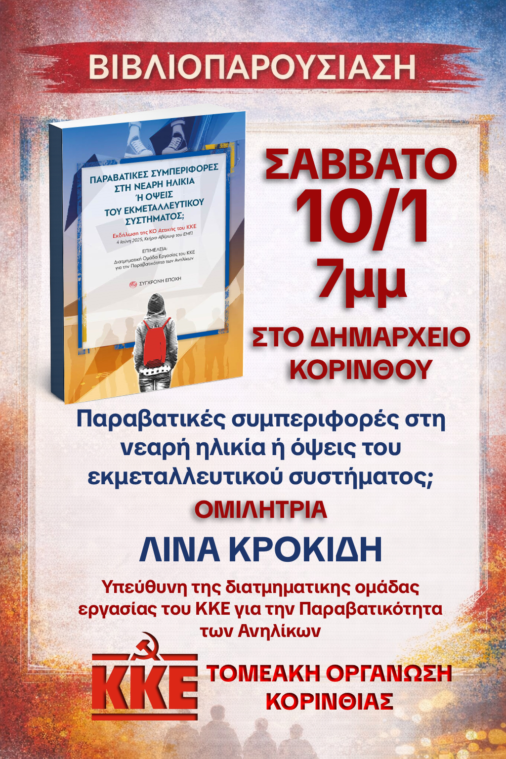 Η ΤΕ Κορινθίας του ΚΚΕ καλεί στη βιβλιοπαρουσίαση της έκδοσης της Σύγχρονης Εποχής, που περιλαμβάνει τα πρακτικά της εκδήλωσης της ΚΟ Αττικής του ΚΚΕ με θέμα «Παραβατικές συμπεριφορές στη νεαρή ηλικία ή όψεις του εκμεταλλευτικού συστήματος;». Η βιβλιοπαρουσίαση θα πραγματοποιηθεί το Σάββατο 10/1 στις 7μμ, στο Δημαρχείο Κορίνθου. Θα μιλήσει η Λίνα Κροκίδη, υπεύθυνη της διατμηματικής ομάδας εργασίας του ΚΚΕ για την Παραβατικότητα των Ανηλίκων.