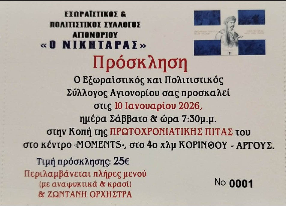 Ο Εξωραϊστικός & Πολιτιστικός Σύλλογος Αγιονορίου "ο Νικηταράς" σας προσκαλεί στην κοπή της Πρωτοχρονιάτικης Πίτας του, το Σάββατο 10 Ιανουαρίου 2026 & ώρα 7:30μ.μ.