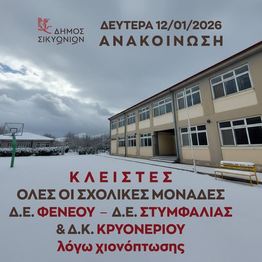 Ο Δήμος Σικυωνίων ενημερώνει ότι, λόγω χιονόπτωσης και για λόγους ασφάλειας μαθητών και εκπαιδευτικών, 𝚶𝚲𝚬𝚺 𝚶𝚰 𝚺𝚾𝚶𝚲𝚰𝚱𝚬𝚺 𝚳𝚶𝚴𝚨𝚫𝚬𝚺 𝚶𝚲𝛀𝚴 𝚻𝛀𝚴 𝚩𝚨𝚯𝚳𝚰𝚫𝛀𝚴 της Δημοτικής Ενότητας Φενεού, της Δημοτικής Ενότητας Στυμφαλίας, καθώς και της Δημοτικής Κοινότητας Κρυονερίου, θα παραμείνουν 𝚱𝚲𝚬𝚰𝚺𝚻𝚬𝚺 σήμερα, Δευτέρα 12 Ιανουαρίου 2026.