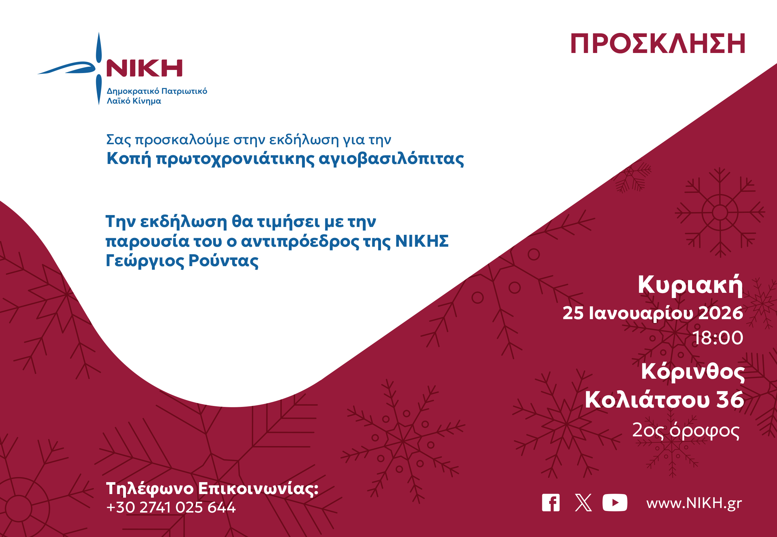 Θα θέλαμε να σας ενημερώσουμε ότι την Κυριακή 25 Ιανουαρίου στις 18.00 μ.μ. στο γραφείο του Δημοκρατικού Πατριωτικού Λαϊκού κινήματος ΝΙΚΗ στην Κόρινθο, οδός Κολιάτσου 36 (2ος όροφος), θα πραγματοποιηθεί εκδήλωση για την κοπή της αγιοβασιλόπιτας.