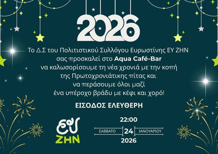 Το Δ.Σ του Πολιτιστικού Συλλόγου Ευρωστίνης ΕΥ ΖΗΝ σας προσκαλεί στο Aqua Café-Bar να καλωσορίσουμε τη νέα χρονιά με την κοπή της Πρωτοχρονιάτικης πίτας και να περάσουμε όλοι μαζί ένα υπέροχο βράδυ με κέφι και χορό!