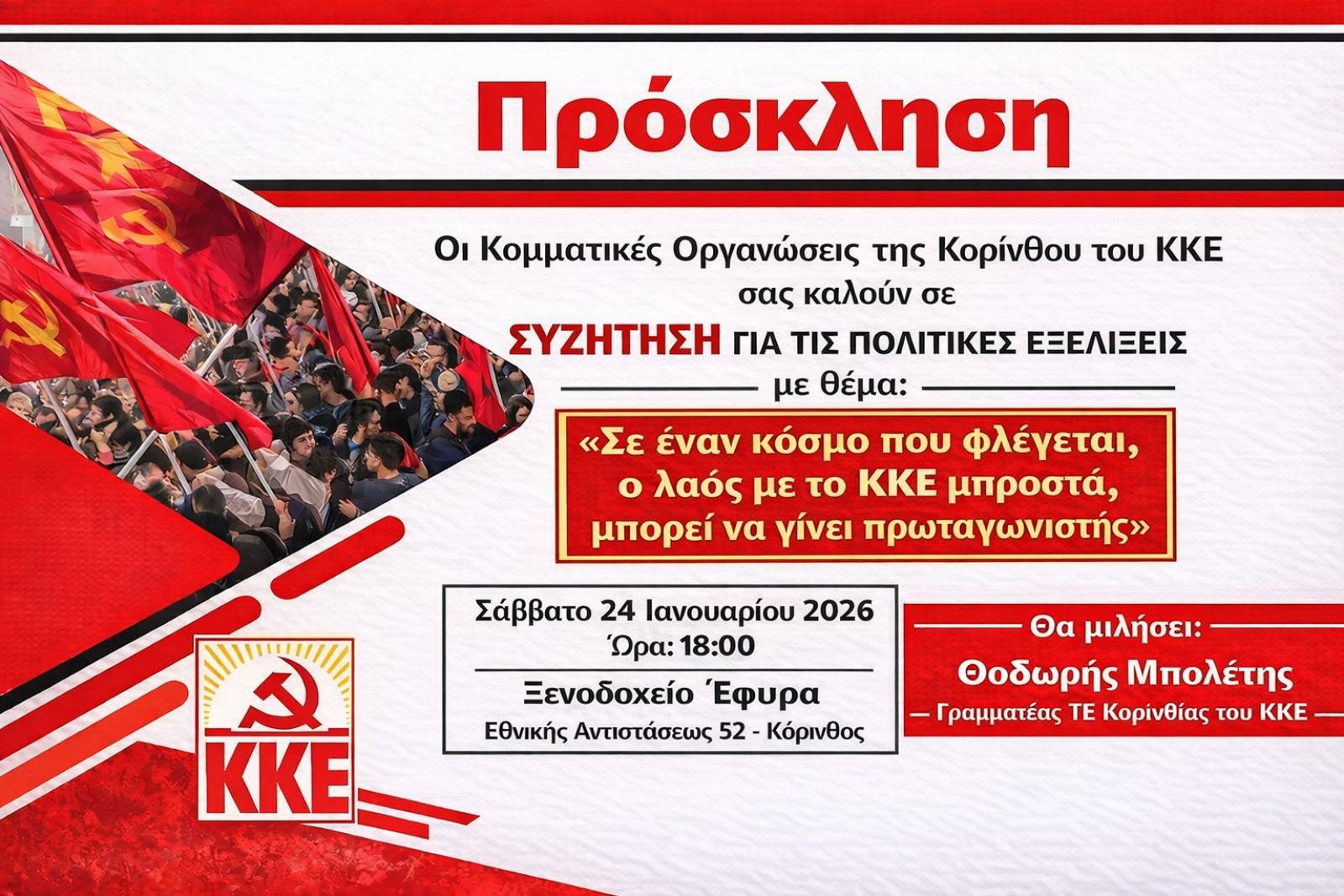 "Οι τελευταίες πολιτικές εξελίξεις - Σε ένα κόσμο που φλέγεται, ο λαός με το ΚΚΕ μπορεί να γίνει πρωταγωνιστής" στην Κόρινθο