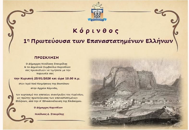 25/01/2026 @ 09:00 Πρόσκληση εορτασμού της επετείου ανακήρυξης της Κορίνθου ως πρώτης πρωτεύουσας των επαναστατημένων Ελλήνων