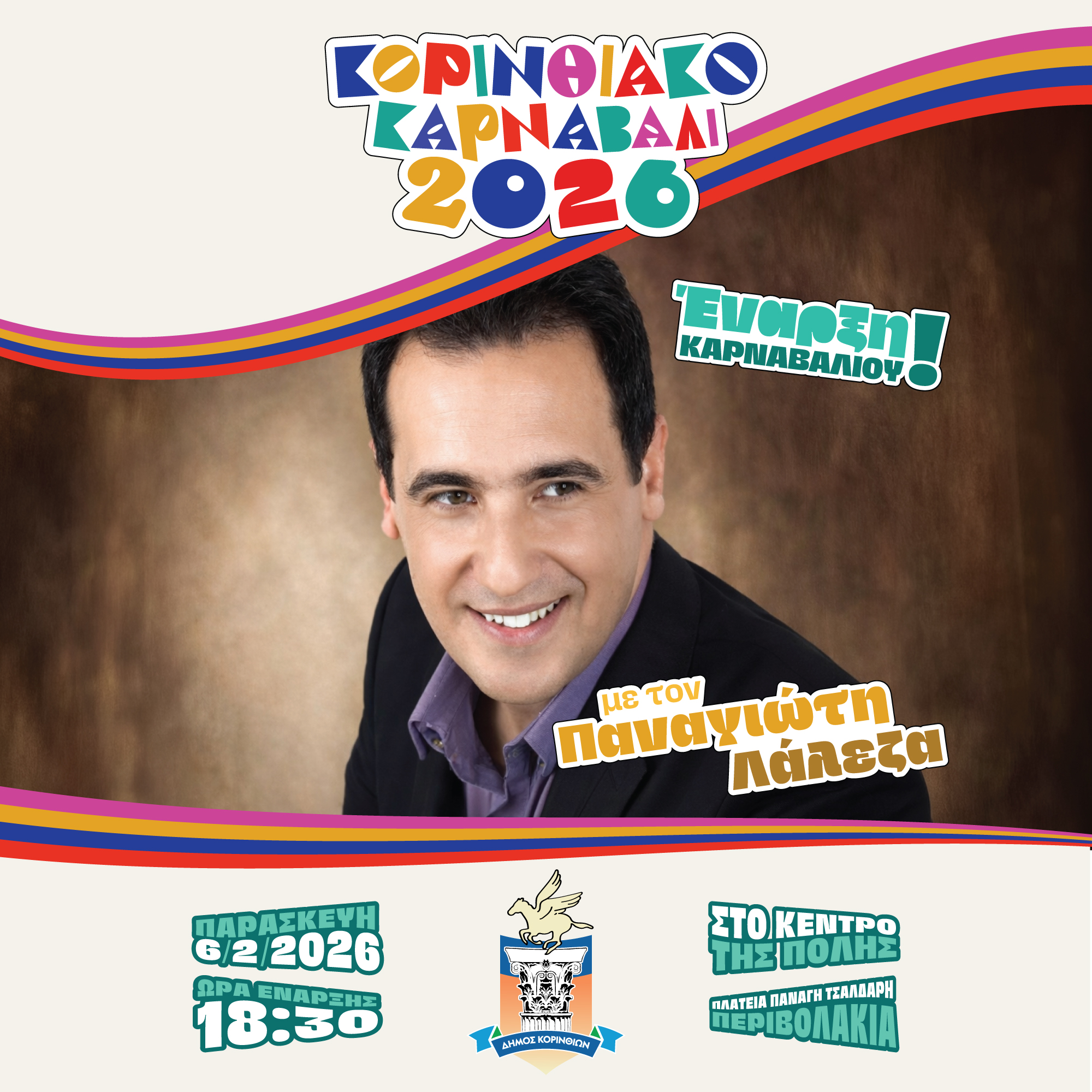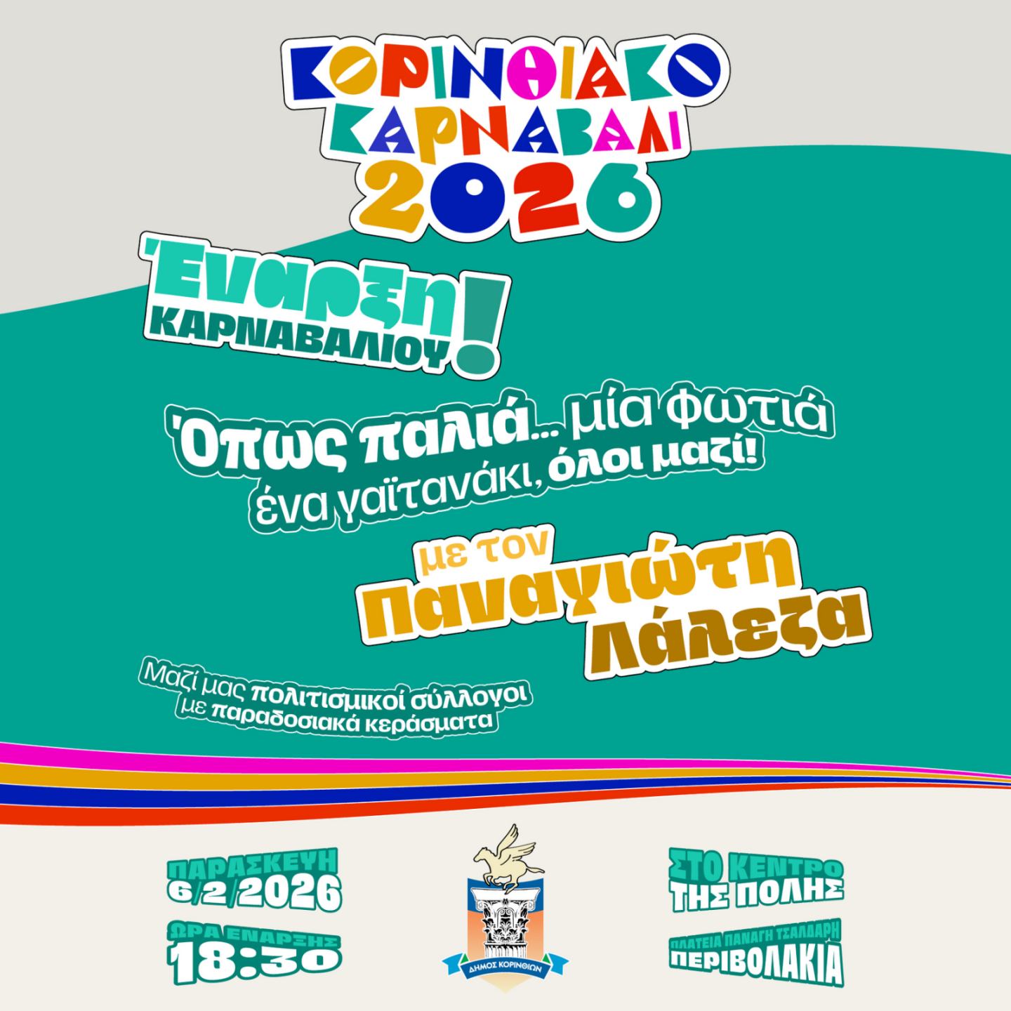 Η Κόρινθος φοράει τα γιορτινά της και ανοίγει διάπλατα την πόρτα στη χαρά, στη μουσική και στη συμμετοχή. Ο Δήμος Κορινθίων κηρύσσει την πανηγυρική έναρξη των καρναβαλικών εκδηλώσεων για το 2026, με μια μεγάλη γιορτή στην καρδιά της πόλης.