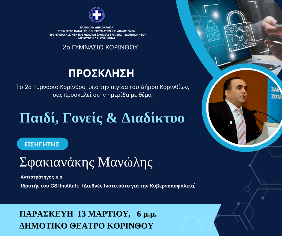 Στο πλαίσιο των δράσεων ενημέρωσης και ευαισθητοποίησης κατά της βίας, το 2ο Γυμνάσιο Κορίνθου διοργανώνει ομιλία με θέμα «Παιδιά – γονείς και διαδίκτυο», την Παρασκευή 13 Μαρτίου 2026 και ώρα 18:00, στο Δημοτικό Θέατρο Κορίνθου. Κεντρικός ομιλητής θα είναι ο κ. Μανώλης Σφακιανάκης, αντιστράτηγος ε.α. και ιδρυτής του Διεθνούς Ινστιτούτου Κυβερνοασφάλειας..
