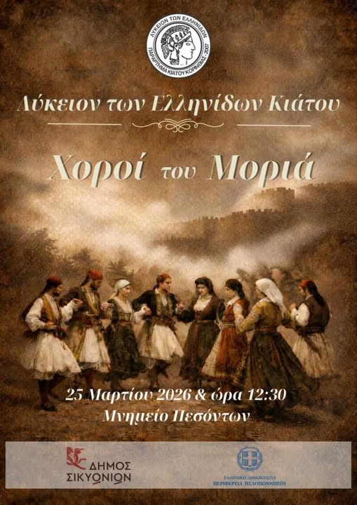 Σας προσκαλούμε να τιμήσετε με την παρουσία σας την εκδήλωση παραδοσιακών χορών «Χοροί του Μοριά» από τους χοροδιδασκάλους Α. Μπόσγα και Μ. Μπόσγα, που διοργανώνει το Λύκειον των Ελληνίδων Κιάτου, την Τετάρτη 25 Μαρτίου 2026 και ώρα 12:30 στο Μνημείο Πεσόντων.
