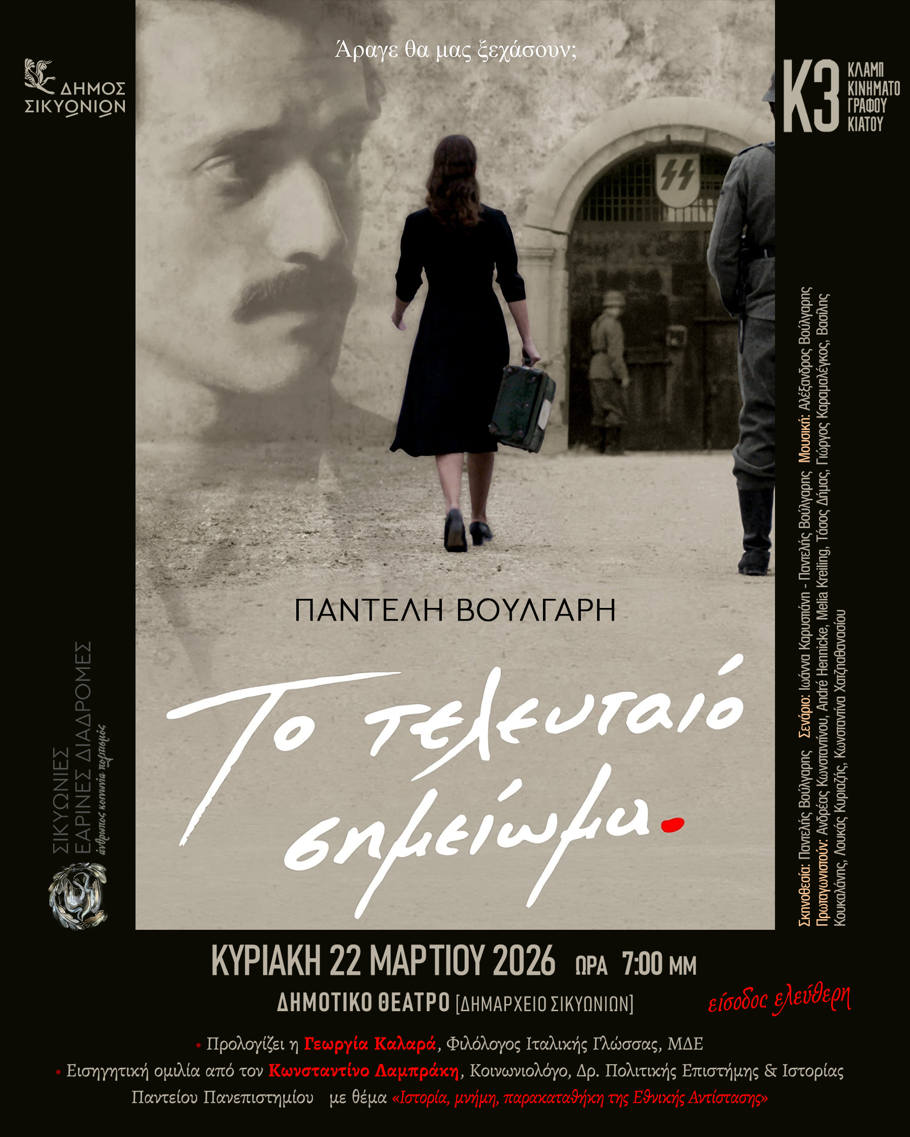 Ο Δήμος Σικυωνίων, συνεχίζοντας τον επιτυχημένο κύκλο δράσεων «Σικυώνιες Εαρινές Διαδρομές: Άνθρωπος – Κοινωνία – Πολιτισμός», στρέφει το βλέμμα στην ιστορική μνήμη και την τέχνη του κινηματογράφου. Σε μια ξεχωριστή συνεργασία με την Κινηματογραφική Λέσχη Κιάτου (Κ3), προσκαλεί τους πολίτες την Κυριακή 22 Μαρτίου 2026 και ώρα 19:00, στο Δημοτικό Θέατρο (Δημαρχείο Σικυωνίων), για την προβολή της εμβληματικής ταινίας του Παντελή Βούλγαρη, «Το Τελευταίο Σημείωμα».