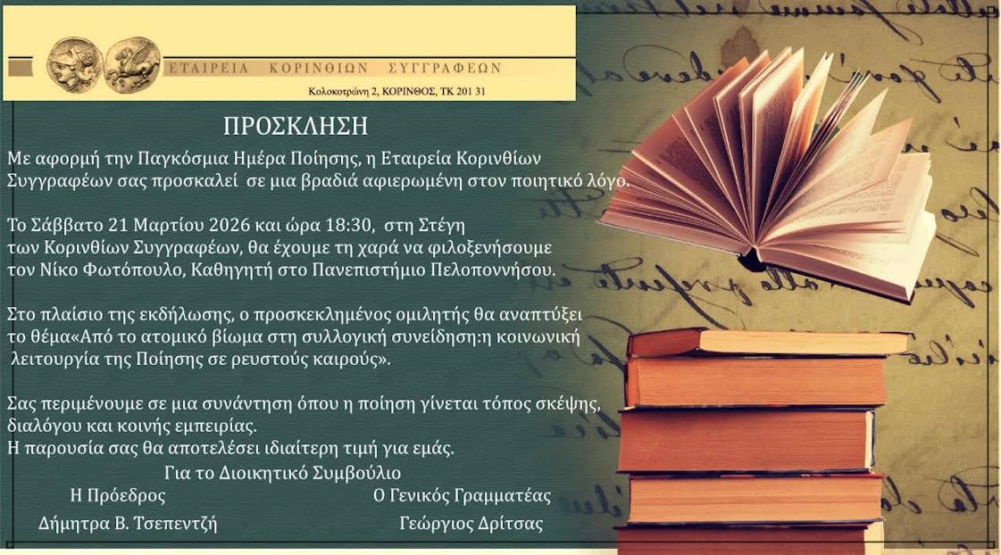 Πολλοί εραστές και εργάτες της Ποίησης, μέλη και φίλοι της Εταιρείας Κορινθίων Συγγραφέων, γέμισαν τη φιλόξενη Στέγη της, στο κάλεσμα του Δ. Σ., το Σάββατο, 21 Μαρτίου 2026 και ώρα 18:30. Ανάμεσα στους παρευρισκόμενους και ο π. Δημήτριος Παπαγεωργίου, Εφημέριος του Ι. Ναού Αγίου Νικολάου Κορίνθου, εκπρόσωπος του Σεβασμιότατου Μητροπολίτου κ. Παύλου.