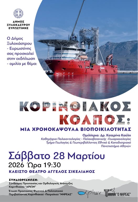 Ο Δήμος Ξυλοκάστρου – Ευρωστίνης σας προσκαλεί στην εκδήλωση – ομιλία με θέμα: «Κορινθιακός Κόλπος: μία χρονοκάψουλα βιοποικιλότητας» με ομιλήτρια την Δρ. Κατερίνα Κούλη, Καθηγήτρια Παλαιοντολογίας, Παλαιοβοτανικής – Γεωαρχαιολογίας, του Τμήματος Γεωλογίας και Γεωπεριβάλλοντος του Εθνικού και Καποδιστριακού Πανεπιστημίου Αθηνών.