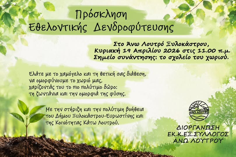 Ο Δήμος Ξυλοκάστρου-Ευρωστίνης ενημερώνει ότι ο Σύλλογος Άνω Λουτρού διοργανώνει δράση δενδροφύτευσης, η οποία θα πραγματοποιηθεί την Κυριακή 19 Απριλίου 2026 στο Άνω Λουτρό.