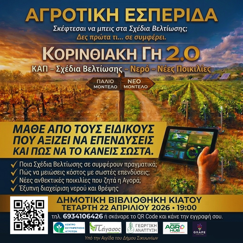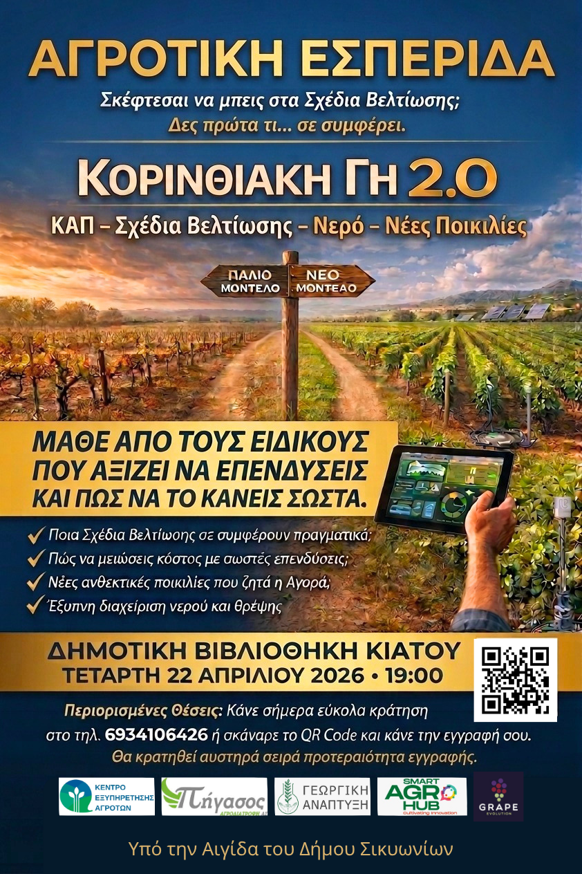 Η γεωργία αλλάζει κατεύθυνση και οι αποφάσεις των παραγωγών γίνονται πλέον πιο κρίσιμες από ποτέ. Σε αυτό το περιβάλλον, όπου η νέα ΚΑΠ, το αυξανόμενο κόστος παραγωγής και οι απαιτήσεις της αγοράς διαμορφώνουν ένα εντελώς διαφορετικό τοπίο, διοργανώνεται η Αγροτική Εσπερίδα «Κορινθιακή Γη 2.0: ΚΑΠ – Σχέδια Βελτίωσης – Νερό – Νέες Ποικιλίες», την Τετάρτη 22 Απριλίου 2026 και ώρα 19:00, στη Δημοτική Βιβλιοθήκη Κιάτου, υπό την αιγίδα του Δήμου Σικυωνίων.