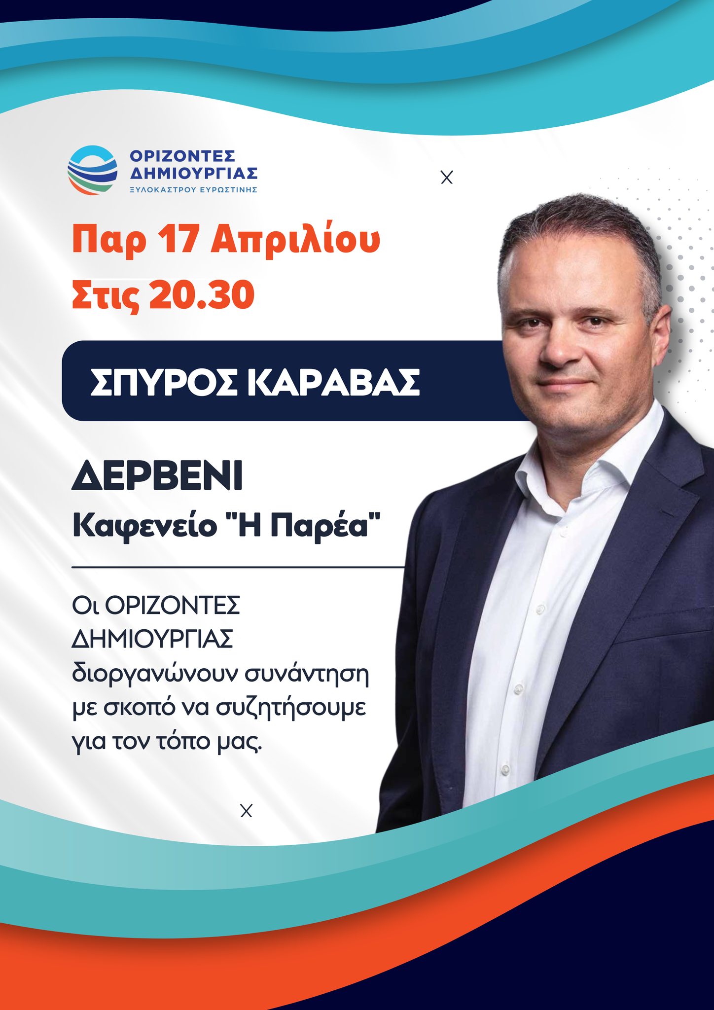 «Οι ΟΡΙΖΟΝΤΕΣ ΔΗΜΙΟΥΡΓΙΑΣ διοργανώνουν ΣΥΝΑΝΤΗΣΗ στο ΔΕΡΒΕΝΙ την Παρασκευή 17 Απριλίου και ώρα 20.30' στο Καφενειο "Η ΠΑΡΕΑ" (Μαρίας Κοντοχριστοπούλου) για να συζητήσουμε τα προβλήματα και τις ευκαιρίες του τόπου μας.» αναφέρεται στην ανακοίνωση.