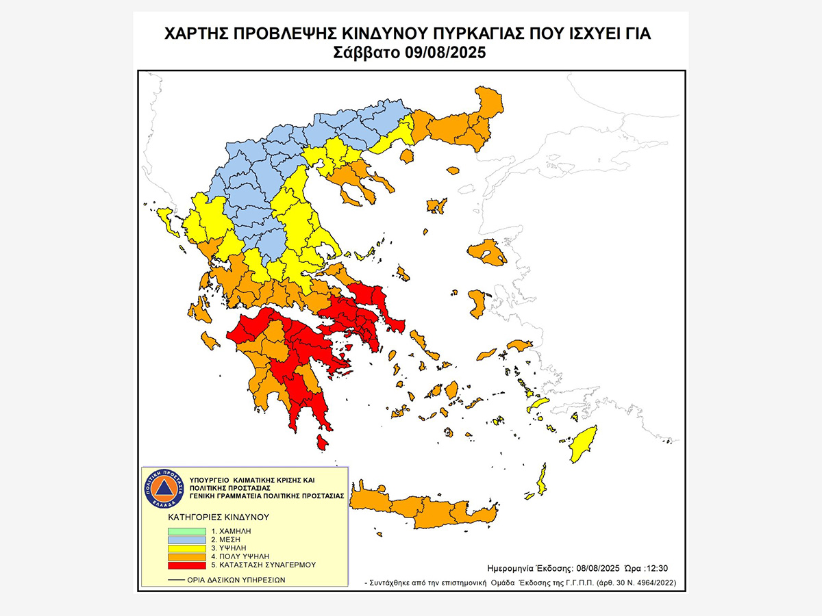 Σύμφωνα με το Χάρτη Πρόβλεψης Κινδύνου Πυρκαγιάς, τον οποίο εκδίδει η Γενική Γραμματεία Πολιτικής Προστασίας του Υπουργείου Κλιματικής Κρίσης & Πολιτικής Προστασίας για το Σάββατο 9 Αυγούστου, σε κατάσταση συναγερμού βρίσκονται οι Νομοί Αργολίδας, Αρκαδίας, Κορινθίας και Λακωνίας, ενώ προβλέπεται πολύ υψηλός κίνδυνος δασικής πυρκαγιάς (κατηγορία κινδύνου 4) στο νομό Μεσσηνίας.