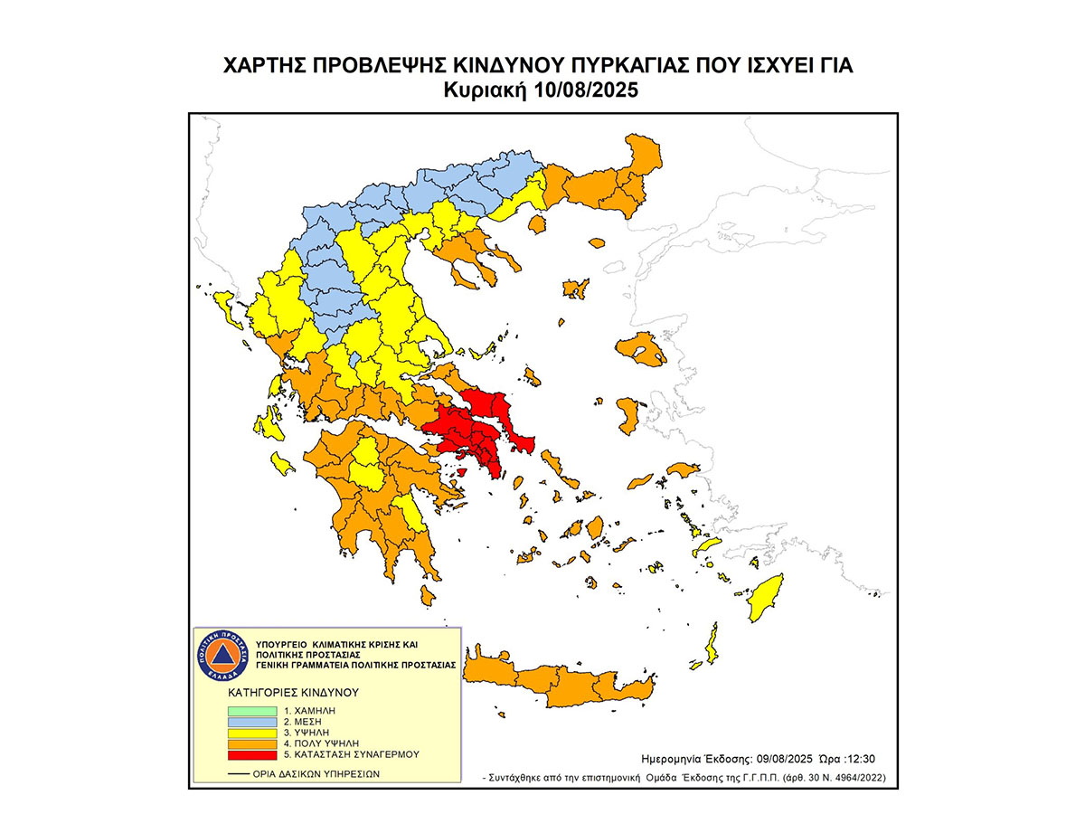 Σύμφωνα με το Χάρτη Πρόβλεψης Κινδύνου Πυρκαγιάς, τον οποίο εκδίδει η Γενική Γραμματεία Πολιτικής Προστασίας του Υπουργείου Κλιματικής Κρίσης & Πολιτικής Προστασίας, για την Κυριακή 10 Αυγούστου, προβλέπεται πολύ υψηλός κίνδυνος δασικής πυρκαγιάς (κατηγορία 4) σε όλες τις Περιφερειακές Ενότητες της Περιφέρειας Πελοποννήσου.