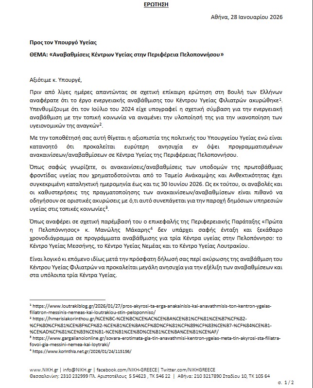 Στο πλαίσιο αυτό, αναφέρεται και στην απουσία σαφούς ένταξης και χρονοδιαγράμματος για τα Κέντρα Υγείας Μεσσήνης, Νεμέας και Λουτρακίου, γεγονός που εντείνει την ανησυχία ότι το παράδειγμα των Φιλιατρών μπορεί να επαναληφθεί.