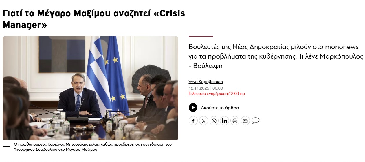 Και έρχεται σήμερα ένα δημοσίευμα του mononews που μιλά για αυτά που περιγράφουμε παραπάνω και την ανάγκη να βρεθεί ένας μάνατζερ κρίσεων για το Μαξίμου.