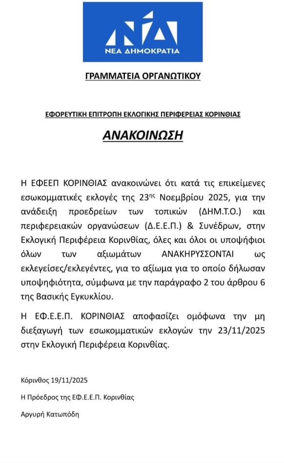 Είναι πολιτικό γεγονός. Και μάλιστα από αυτά που, αν και περνούν συνήθως «χαμηλά», λένε πολλά για το τι πραγματικά συμβαίνει στο εσωτερικό ενός κόμματος. Στο χαρτί, το μήνυμα φαίνεται καθαρό: δεν υπήρξαν αντίπαλες υποψηφιότητες για κανένα αξίωμα, άρα δεν υπάρχει λόγος για κάλπες. Στην πράξη όμως, η εικόνα αυτή ανοίγει σοβαρή συζήτηση για το μέλλον των κομματικών οργανώσεων στην Κορινθία.