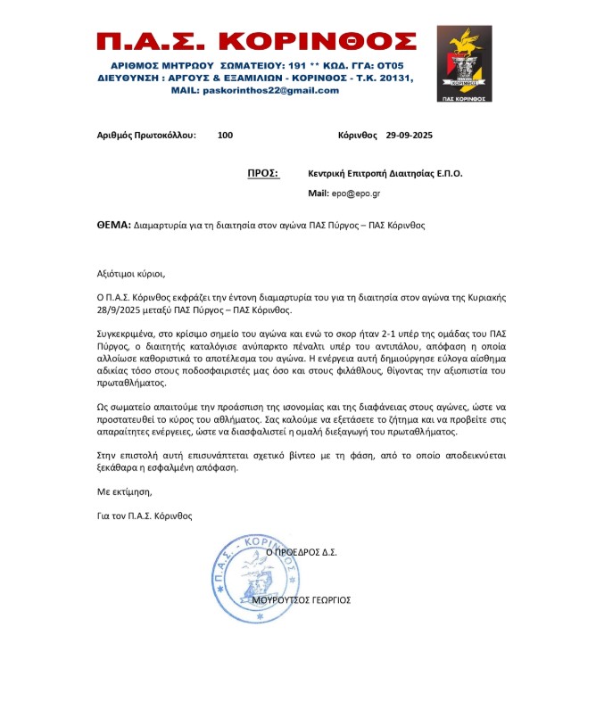 ΠΑΣ ΚΟΡΙΝΘΟΣ – ΔΙΑΜΑΡΤΥΡΙΑ ΓΙΑ ΤΗ ΔΙΑΙΤΗΣΙΑ