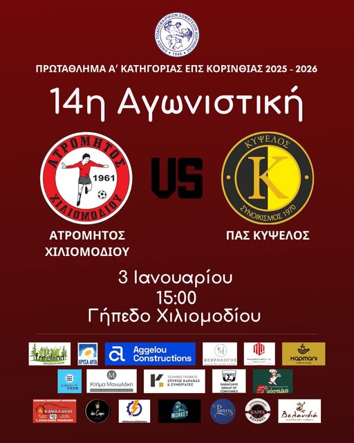 ΑΘΛΗΤΙΚΑ ΚΟΡΙΝΘΙΑ ΑΘΛΗΤΙΚΑ Ατρόμητος Χιλιομοδίου vs ΠΑΣ Κύψελος Κορίνθου σήμερα το μεσημέρι 03/01/2026 @ 10:39 Copied to clipboard Διαβάστε επίσης 28/01/2026 @ 11:13 Επισκέψεις μαθητών στον Σεβ. Μητροπολίτη Κορίνθου κ. Παύλο (ΦΩΤΟ) 28/01/2026 @ 10:51 Δήμος Σικυωνίων: Ένας «μαραθώνιος» έργων για την αντιπλημμυρική θωράκιση του παραλιακού μετώπου 28/01/2026 @ 10:33 Συλλυπητήριο μήνυμα του Εργατικού Κέντρου Κορίνθου για τις νεκρές εργάτριες της βιομηχανίας «ΒΙΟΛΑΝΤΑ» 27/01/2026 @ 20:00 Δήμος Σκυωνίων: Παρών σε εκδηλώσεις συλλόγων της περιοχής ο Δημήτρης Πιστεύος (ΦΩΤΟ) 27/01/2026 @ 19:23 Ξεκινάει αύριο την λειτουργία του ο Βρεφονηπιακός Σταθμός Αθικίων Ροή ειδήσεων 28/01/2026 @ 14:04 Κόρινθος: Υπεγράφη η σύμβαση για το «μπαλόνι» 28/01/2026 @ 12:53 Δήμος Βέλου Βόχας: 𝚷𝛒ό𝛔𝛋𝛌𝛈𝛔𝛈 𝛔𝛕𝛈𝛎 𝛋𝛐𝛑ή 𝛕𝛈ς 𝚷𝛒𝛚𝛕𝛐𝛘𝛒𝛐𝛎𝛊ά𝛕𝛊𝛋𝛈ς 𝚷ί𝛕𝛂ς 28/01/2026 @ 11:43 Όραση: Γιατί δακρύζουν τα μάτια στο κρύο; 28/01/2026 @ 11:13 Επισκέψεις μαθητών στον Σεβ. Μητροπολίτη Κορίνθου κ. Παύλο (ΦΩΤΟ) 28/01/2026 @ 10:51 Δήμος Σικυωνίων: Ένας «μαραθώνιος» έργων για την αντιπλημμυρική θωράκιση του παραλιακού μετώπου 28/01/2026 @ 10:33 Συλλυπητήριο μήνυμα του Εργατικού Κέντρου Κορίνθου για τις νεκρές εργάτριες της βιομηχανίας «ΒΙΟΛΑΝΤΑ» 28/01/2026 @ 10:24 Γ. Ψυχογιός: Πολιτική για τη νόμιμη μετανάστευση χωρίς κανόνες για όλους και κράτος δικαίου δεν γίνεται 27/01/2026 @ 20:00 Δήμος Σκυωνίων: Παρών σε εκδηλώσεις συλλόγων της περιοχής ο Δημήτρης Πιστεύος (ΦΩΤΟ) 27/01/2026 @ 19:23 Ξεκινάει αύριο την λειτουργία του ο Βρεφονηπιακός Σταθμός Αθικίων 27/01/2026 @ 19:01 Ο Δήμος Κορινθίων κοντά στους ανθρώπους, όπου υπάρχει ανάγκη 27/01/2026 @ 18:03 Κορινθία: Τα Δρομολόγια των Κινητών Αστυνομικών Μονάδων για την εβδομάδα 27/01/2026 @ 17:00 Στοχευμένες αστυνομικές επιχειρήσεις πραγματοποιήθηκαν στην Αργολίδα, στην Κορινθία και στη Μεσσηνία 27/01/2026 @ 16:19 Η Ακαδημία μπάσκετ του ΑΟΞ κόβει την πίτα του αυτό το Σάββατο 27/01/2026 @ 13:57 Aυτοκίνητο διέλυσε μαγαζί στο Λουτράκι(ΦΩΤΟ) 27/01/2026 @ 12:53 Μεγάλη εμπορική συμφωνία ΕΕ - Ινδίας δημιουργεί μια αγορά 2 δισ. πολιτών: Πόσο πέφτουν οι δασμοί, ποια ελληνικά προϊόντα αφορά, δείτε πίνακες 27/01/2026 @ 12:13 Καμία απάντηση του Γ.Γ. του ΝΑΤΟ Μ. Ρούτε στον Γ. Μανιάτη για το άρθρο 5 του ΝΑΤΟ. 27/01/2026 @ 11:00 Δημοσκόπηση Interview: Ανέτοιμη για το 70% η Καρυστιανού, 1 στους 2 έχει χειρότερη εικόνα μετά τη δήλωση για τις αμβλώσεις 27/01/2026 @ 10:38 Όταν η διεκδίκηση φέρνει αποτέλεσμα και η αδράνεια ψάχνει άλλοθι 27/01/2026 @ 10:33 Σε εκδηλώσεις κοπής πίτας ο Σεβ.Μητροπολίτης κ. Παύλος 27/01/2026 @ 10:30 Αναβάλλεται λόγω της τραγωδίας ο αγώνας Α.Ο Τρίκαλα – ΠΑΣ Κόρινθος Δείτε επίσης 27/01/2026 @ 13:57 Aυτοκίνητο διέλυσε μαγαζί στο Λουτράκι(ΦΩΤΟ) 27/01/2026 @ 12:53 Μεγάλη εμπορική συμφωνία ΕΕ - Ινδίας δημιουργεί μια αγορά 2 δισ. πολιτών: Πόσο πέφτουν οι δασμοί, ποια ελληνικά προϊόντα αφορά, δείτε πίνακες 27/01/2026 @ 12:13 Καμία απάντηση του Γ.Γ. του ΝΑΤΟ Μ. Ρούτε στον Γ. Μανιάτη για το άρθρο 5 του ΝΑΤΟ. 26/01/2026 @ 14:02 Παρατείνεται η προθεσμία για αιτήματα τροποποίησης των ΓΠΣ -Αφορά τα ΓΠΣ Κορίνθου, Άσσου – Λέχαιου και το ΣΧΟΑΠ Τενέας 26/01/2026 @ 13:32 1η Φεβρουαρίου γενική συνέλευση του ΠΑΣ Κόρινθος 26/01/2026 @ 12:41 Π. Μαρινάκης: Αναφαίρετο δικαίωμα της Ελλάδας η επέκταση των χωρικών υδάτων που θα το ασκήσει στον σωστό χρόνο 26/01/2026 @ 11:25 Παραμένει στην Α.Δ.Κορινθίας ο Ιωάννης Αθανασόπουλος 26/01/2026 @ 10:46 Ο Τρίτος Αναπτυξιακός Άξονας της Πελοποννήσου