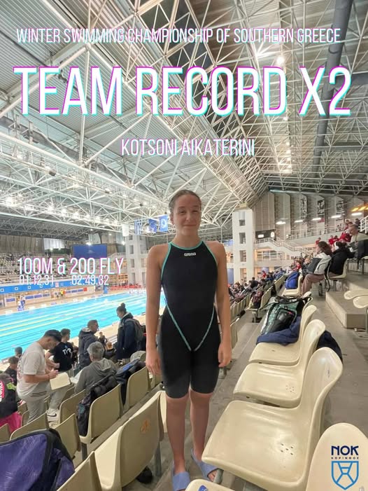 Στο Χειμερινό Πρωτάθλημα Νοτίου Ελλάδος, η Κοτσώνη Αικατερίνη πέτυχε δύο νέα ρεκόρ ομάδας στις κατηγορίες Κορασίδων,Νεανίδων & Open στα 100μ και 200μ πεταλούδα!
