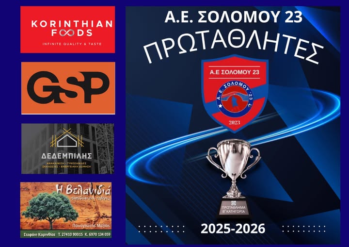 Η Α.Ε. ΣΟΛΟΜΟΥ 23 ολοκλήρωσε μια ονειρική σεζόν, κατακτώντας το Πρωτάθλημα της Β’ Κατηγορίας Ε.Π.Σ Κορινθίας επιβεβαιώνοντας την απόλυτη κυριαρχία της στο γήπεδο!