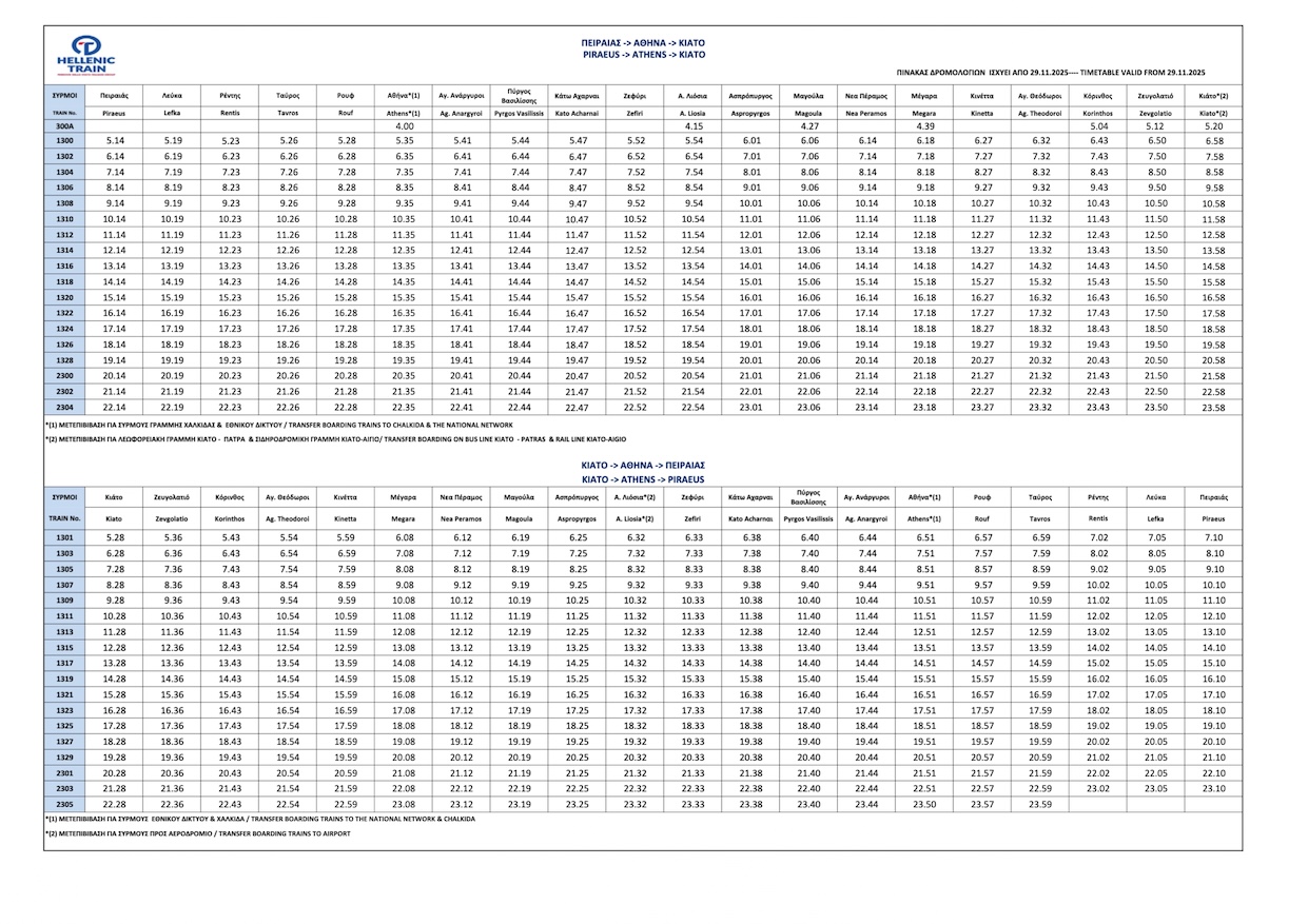 Η Hellenic Train αποφάσισε ότι από το Σάββατο 29 Νοεμβρίου 2025, θα εφαρμοστεί νέα ώρα αναχώρησης για την αμαξοστοιχία 1301 (Κιάτο – Πειραιάς), στο πλαίσιο της συνολικής αναδιάρθρωσης των δρομολογίων του Προαστιακού και της προσπάθειας για πιο σταθερή, συνεπή και φιλική προς τον επιβάτη καθημερινή μετακίνηση.