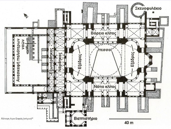 Τα σφαιρικά τρίγωνα είναι οι γωνίες της τετράγωνης βάσης του τρούλου οι οποίες καμπυλώνουν προς τα πάνω μέσα στον τρούλο και μεταφέρουν τα φορτία. Ο φέρων οργανισμός συμπληρώνεται με δύο μεγάλα ημιθόλια κατά τον μεγάλο άξονα, τέσσερα μικρά ημιθόλια που στηρίζονται στους μεγάλους και μικρούς πεσσούς και δύο ημικυλινδρικούς θόλους πάνω από τη βασιλική πύλη και από το Ιερό Βήμα. Ολόσωμοι κίονες ποικίλων υψών μεταφέρουν τα φορτία στο έδαφος μέσω της θεμελίωσης. Το σχέδιο συμπληρώνεται με την αψίδα του ιερού ανατολικά του ορθογωνίου ενώ δυτικά προστίθενται νάρθηκας και εξωνάρθηκας και μια μεγάλη υπαίθρια αυλή που περιβάλλεται από στοές.