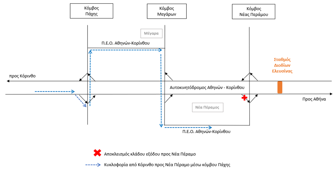 Η κυκλοφορία από Κόρινθο προς Νέα Πέραμο θα εξυπηρετείται από τον προηγούμενο κόμβο Πάχης (Χ.Θ. 41,3) σύμφωνα με το ακόλουθο σχηματικό διάγραμμα: