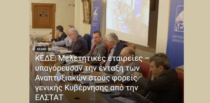 Έντονη συζήτηση και αποκαλύψεις προκάλεσε στη συνεδρίαση της Κεντρική Ένωση Δήμων Ελλάδας (ΚΕΔΕ) το ζήτημα της ένταξης των Αναπτυξιακών Οργανισμών Τοπικής Αυτοδιοίκησης (ΑΟΤΑ) στο Μητρώο Φορέων της Γενικής Κυβέρνησης από την ΕΛΣΤΑΤ. Η ΚΕΔΕ κατέληξε σε απόφαση με την οποία ζητά ουσιαστικά την αποκατάσταση της λειτουργίας των οργανισμών αυτών, υποστηρίζοντας ότι η ένταξή τους έγινε χωρίς διαβούλευση με την αυτοδιοίκηση και δημιουργεί σοβαρά προβλήματα στη λειτουργία τους. Από όλους διατυπώθηκε η άποψη ότι οι νέες διατάξεις προήλθαν από πιέσεις εταιρειών που χάνουν δουλειές.